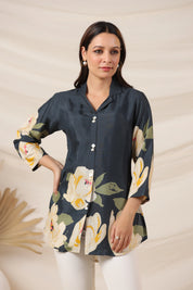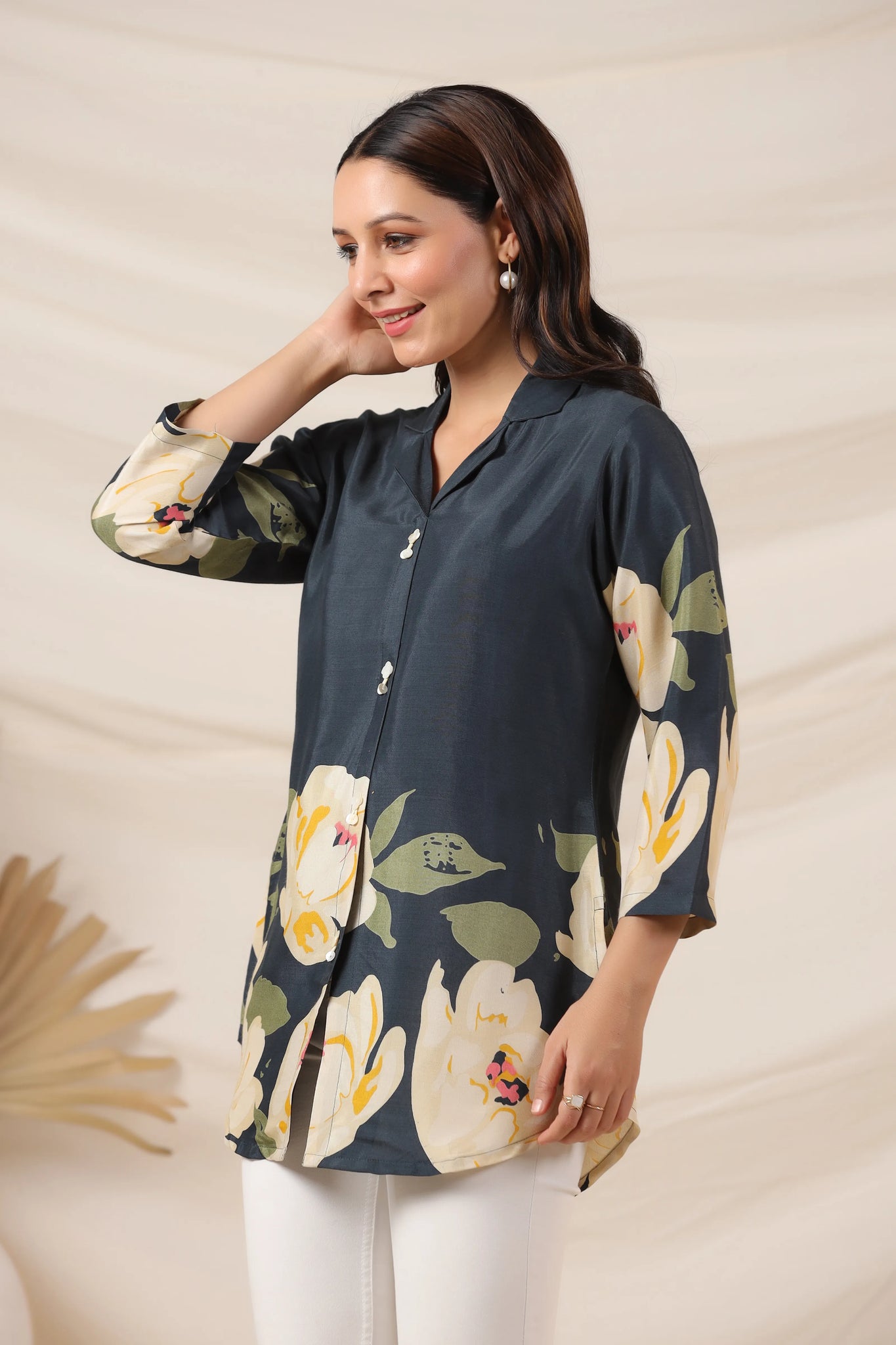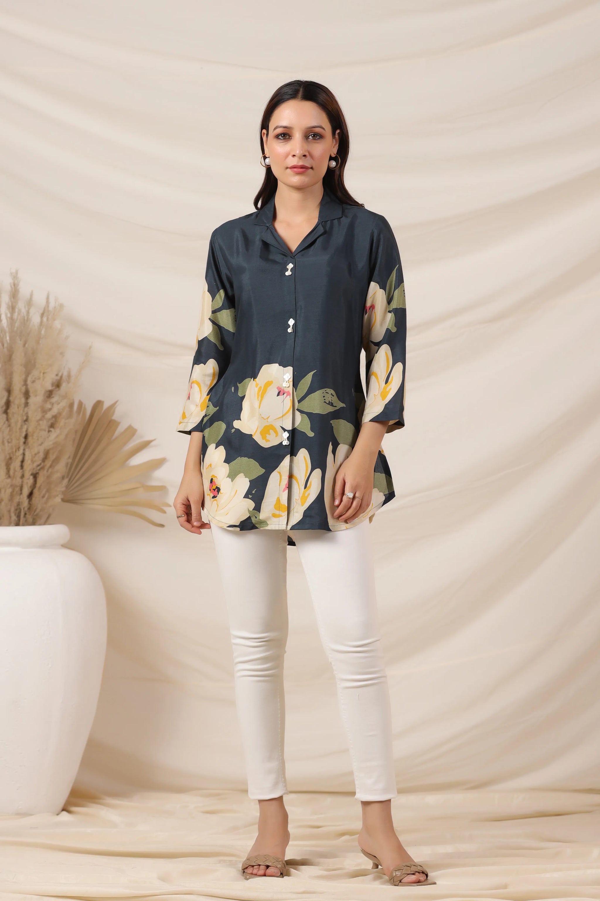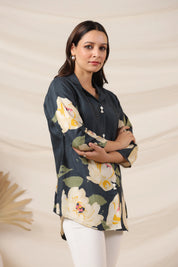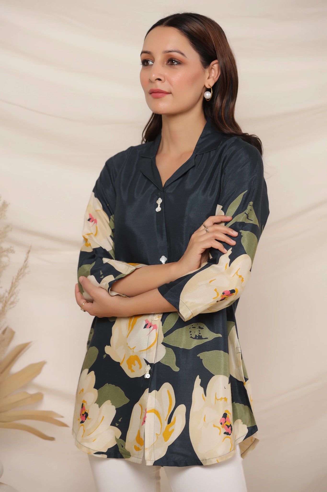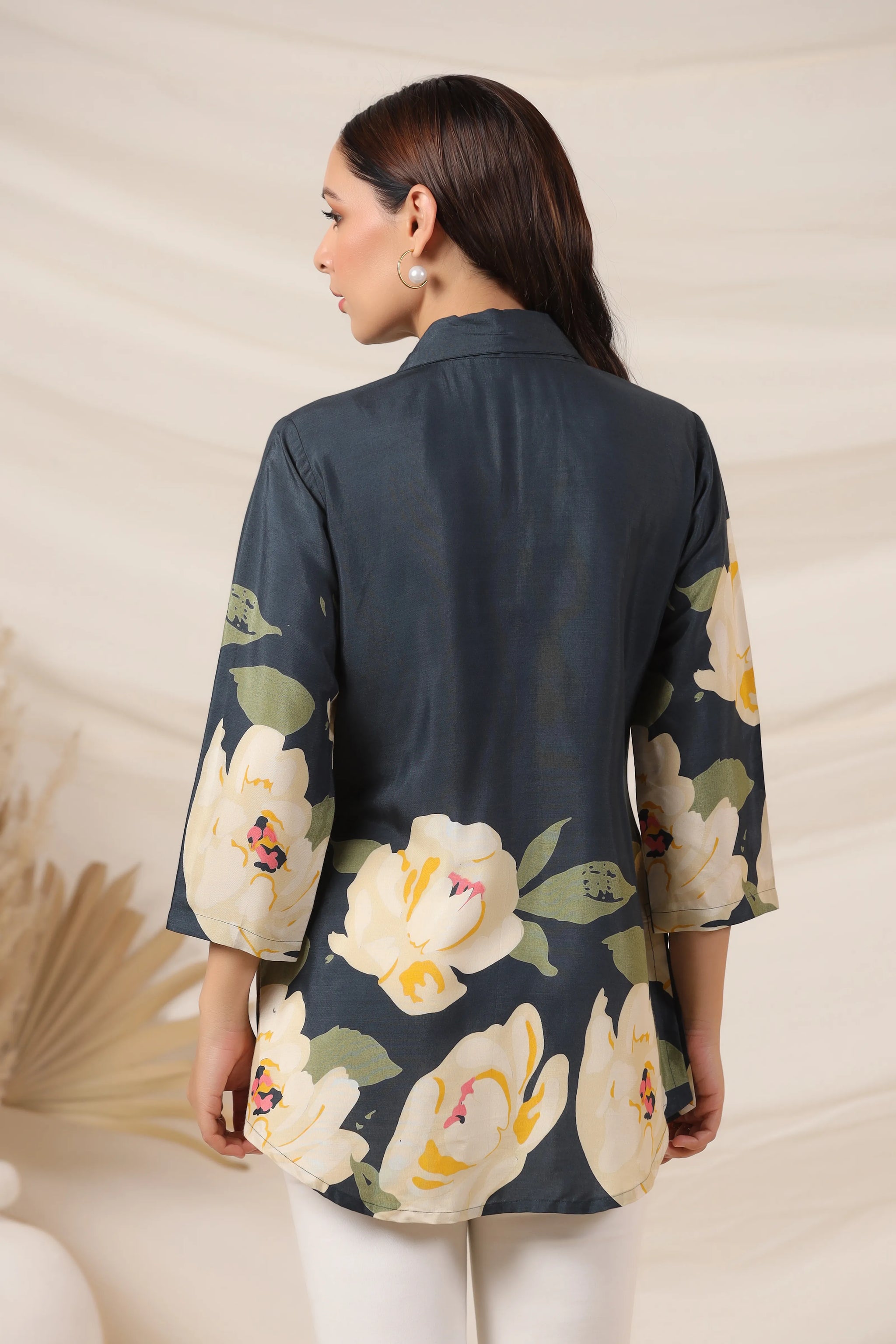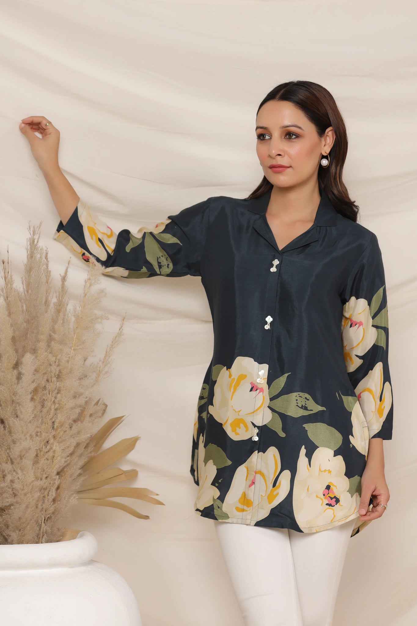 Elevate your everyday style with this elegant peacock blue top—where luxurious texture meets blooming confidence. Crafted in smooth Russian silk, the top drapes effortlessly while the oversized floral print adds a splash of feminine vibrance in ivory, yellow, olive, and soft pink tones.