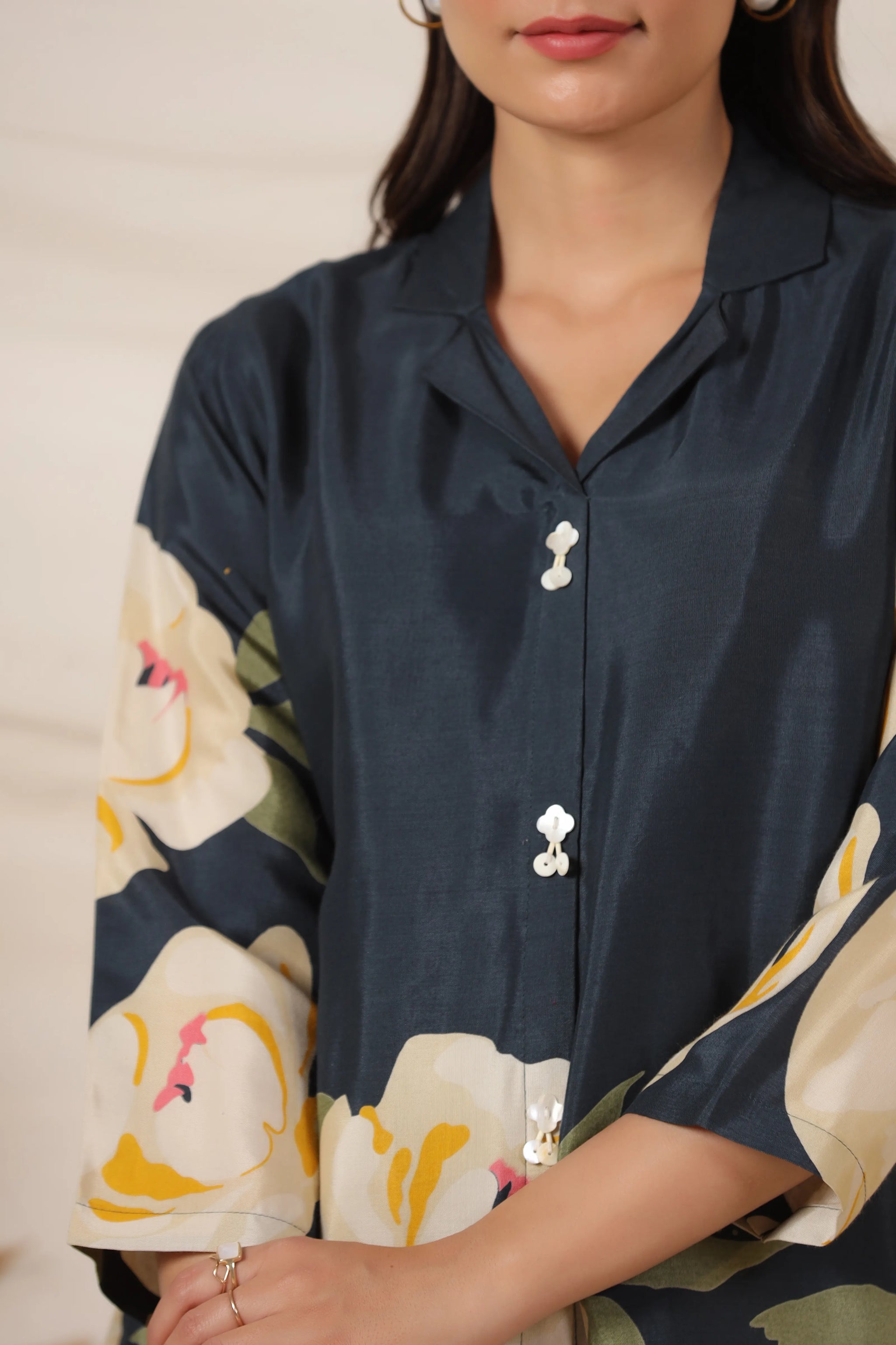 Botanic Luxe: Peacock Blue Bold Floral Top in Russian Silk