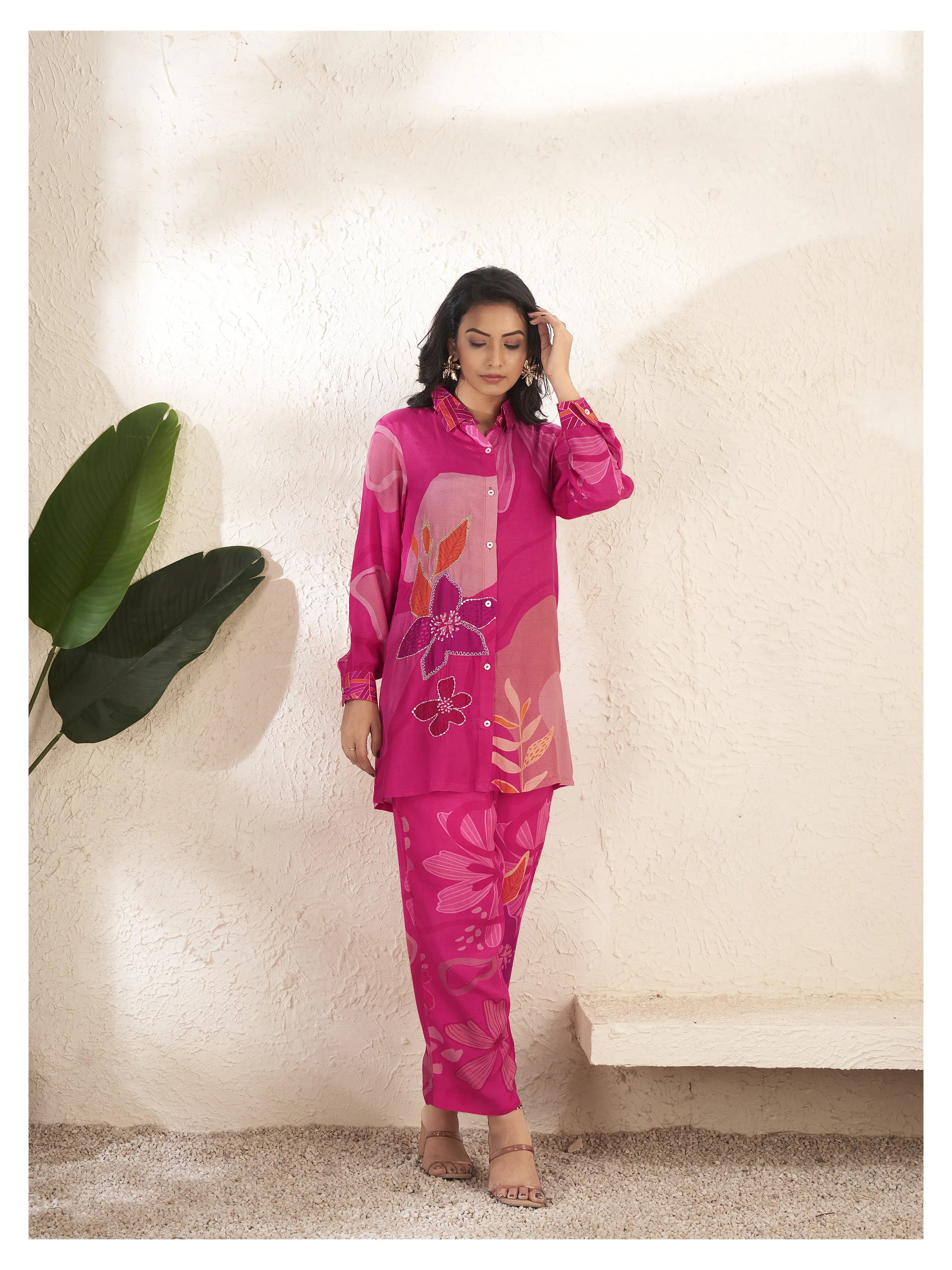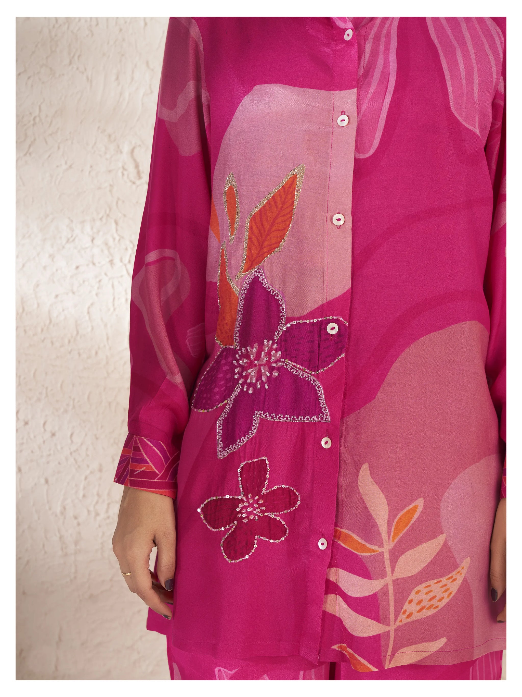 • Pink floral sequin-embellished shirt with an elegant floral print