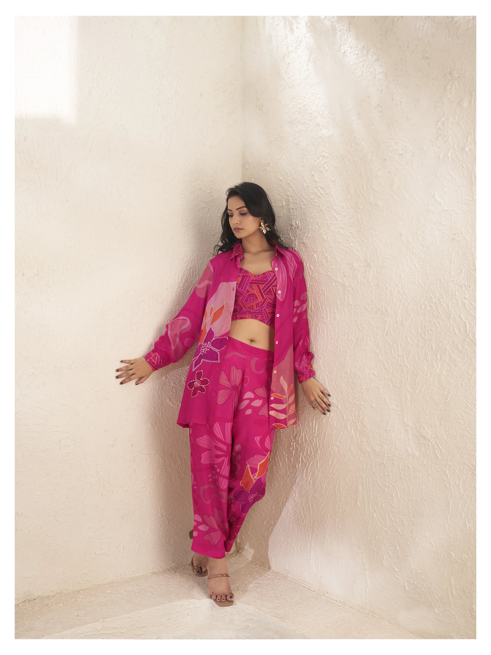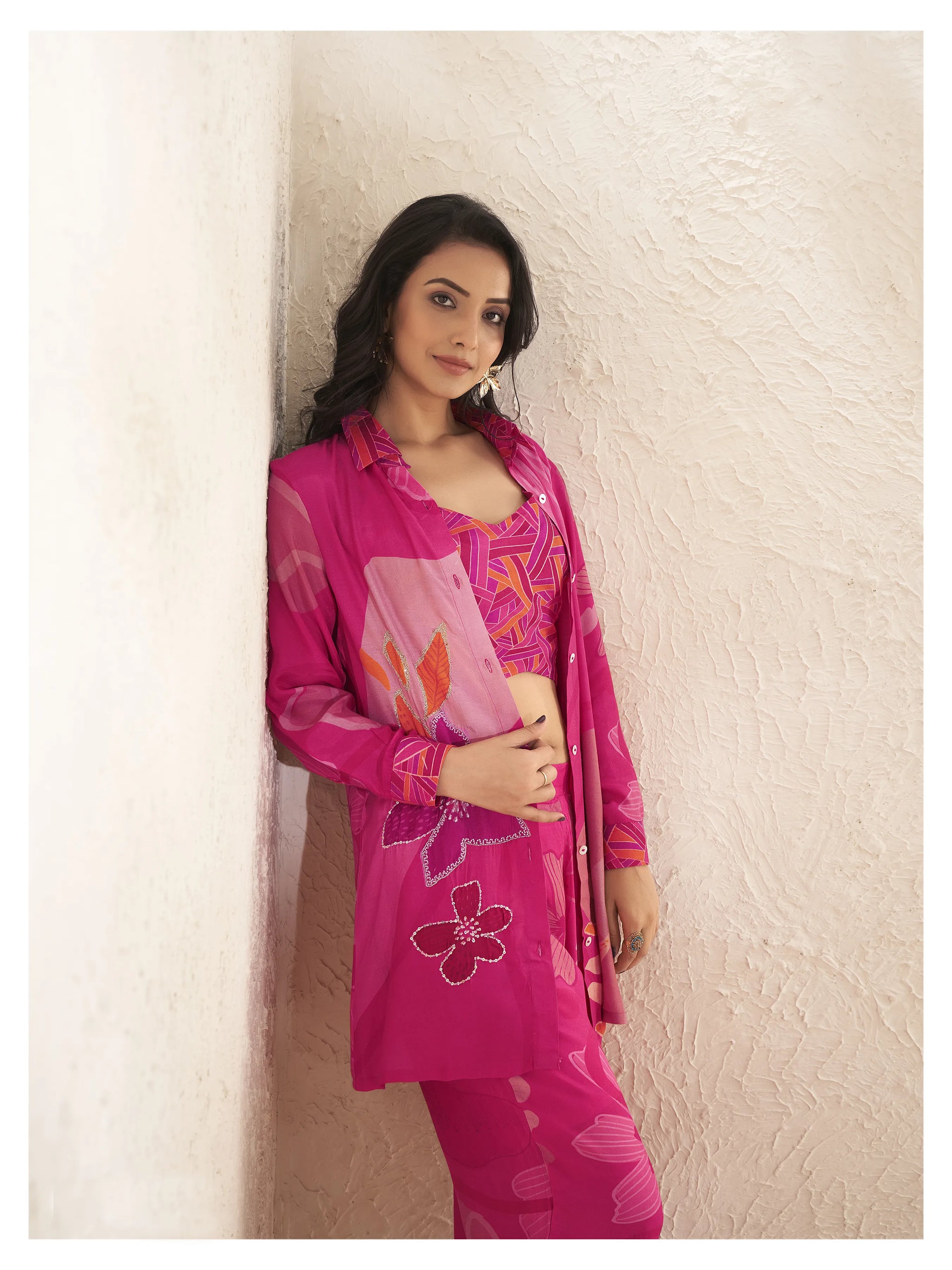 Radiate elegance and charm with this Pink Floral Sequins 3-Piece Co-Ord Set, designed for effortless sophistication. This set includes a sequin-embellished floral print shirt, a chic camisole, and matching trousers, offering the perfect blend of style and comfort.