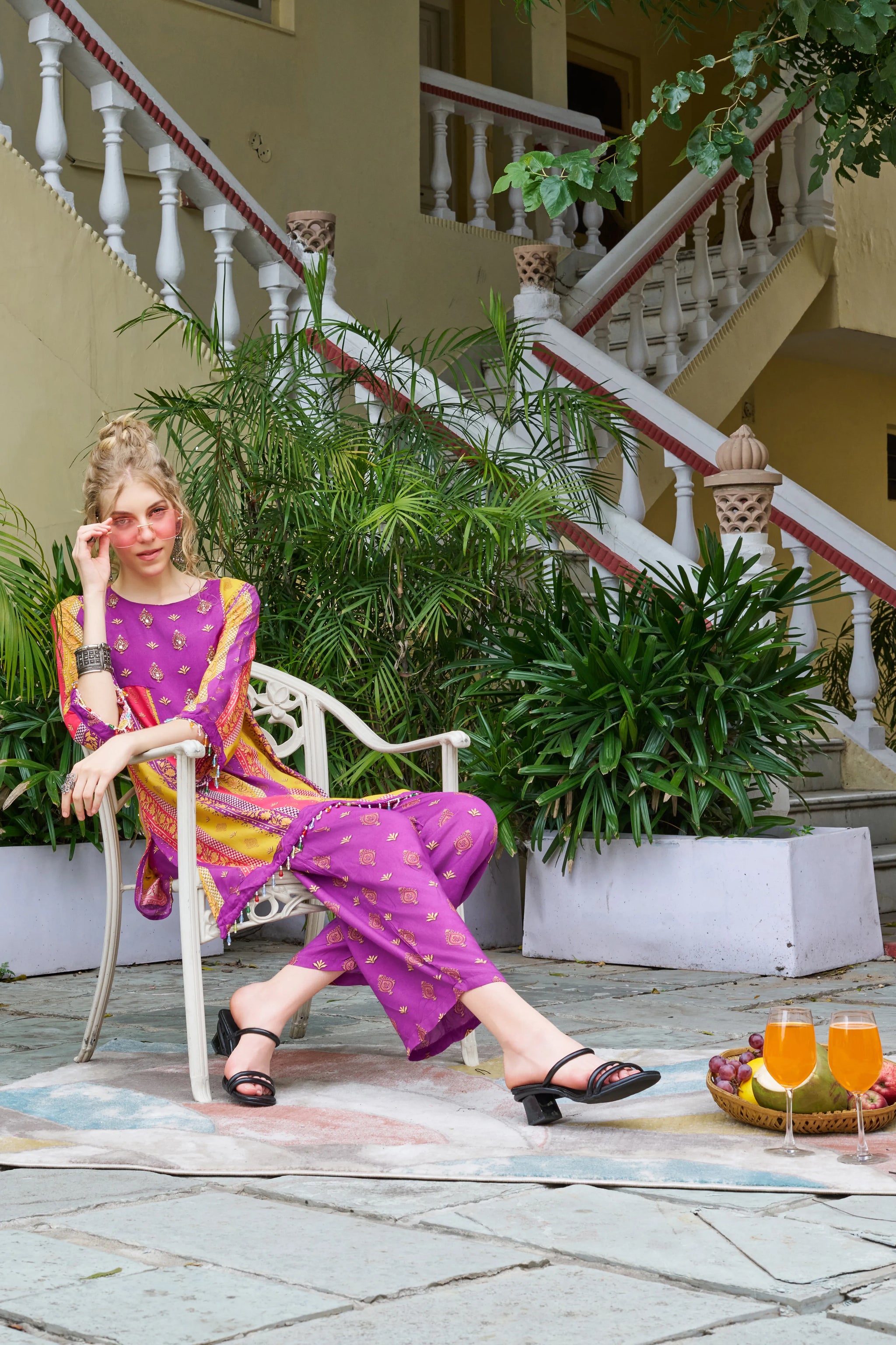 Bring home the beauty of vibrant Indian aesthetics with the Gulaal Stripe co-ord set. Crafted in soft muslin, this lively ensemble features ethnic motif vertical stripes in rich shades of purple, mustard, red, and pink. The kurti is adorned with sequin work detailing on the yoke, a round neckline with a back keyhole & loop button, and beads on the sleeves and hem for an elevated festive touch. It pairs beautifully with a matching printed palazzo featuring an elastic waistband and practical pockets.