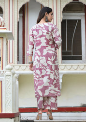 Add a pop of color to your wardrobe with this stunning purple floral co-ord set, crafted in soft, breathable cotton. The kurta features a bold floral print, a flattering V-neck, and a long length with a straight hem for a sleek and comfortable silhouette. Paired with matching printed trousers, complete with a partially elasticated waistband and drawstring for extra comfort, this set offers effortless style for any casual occasion.