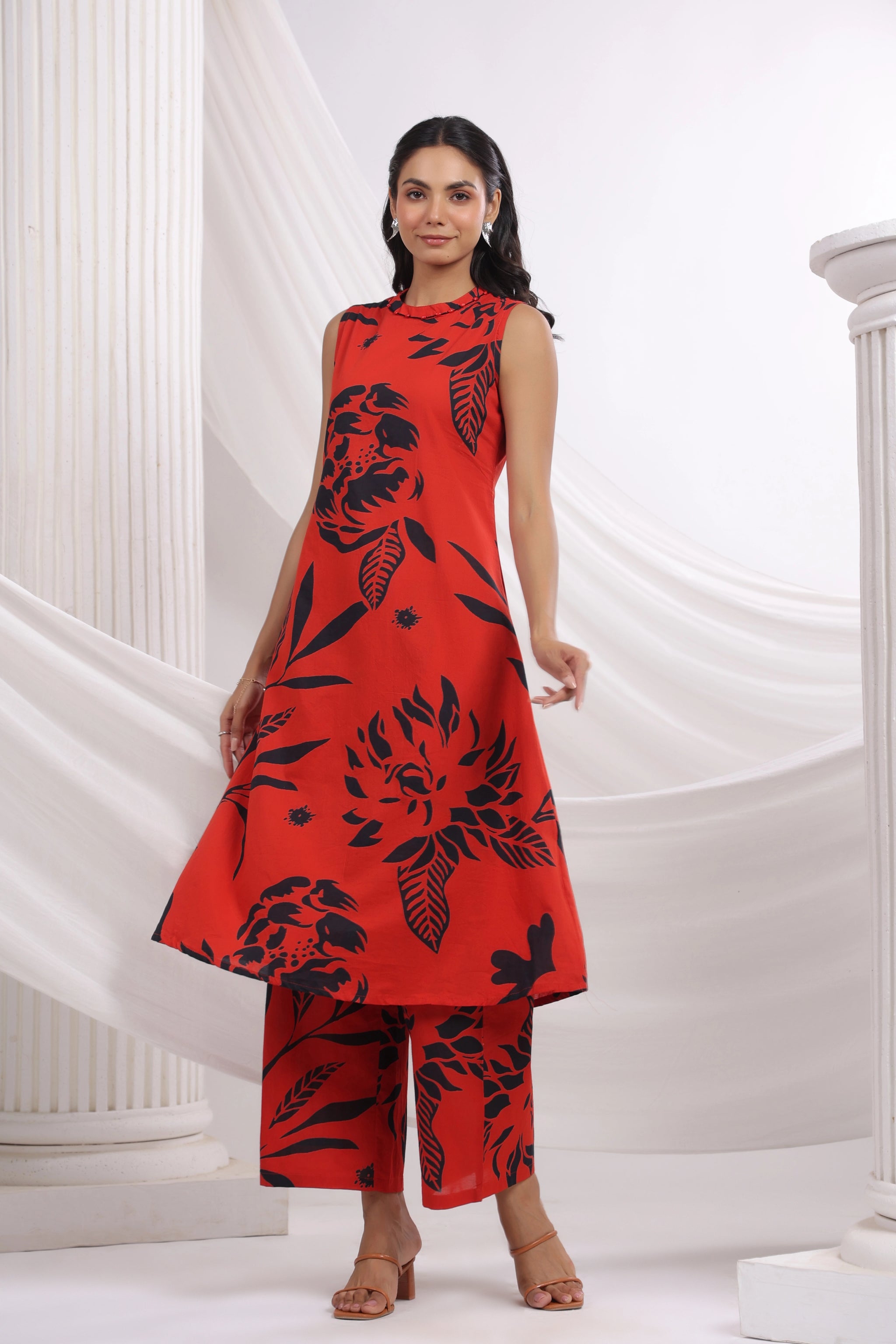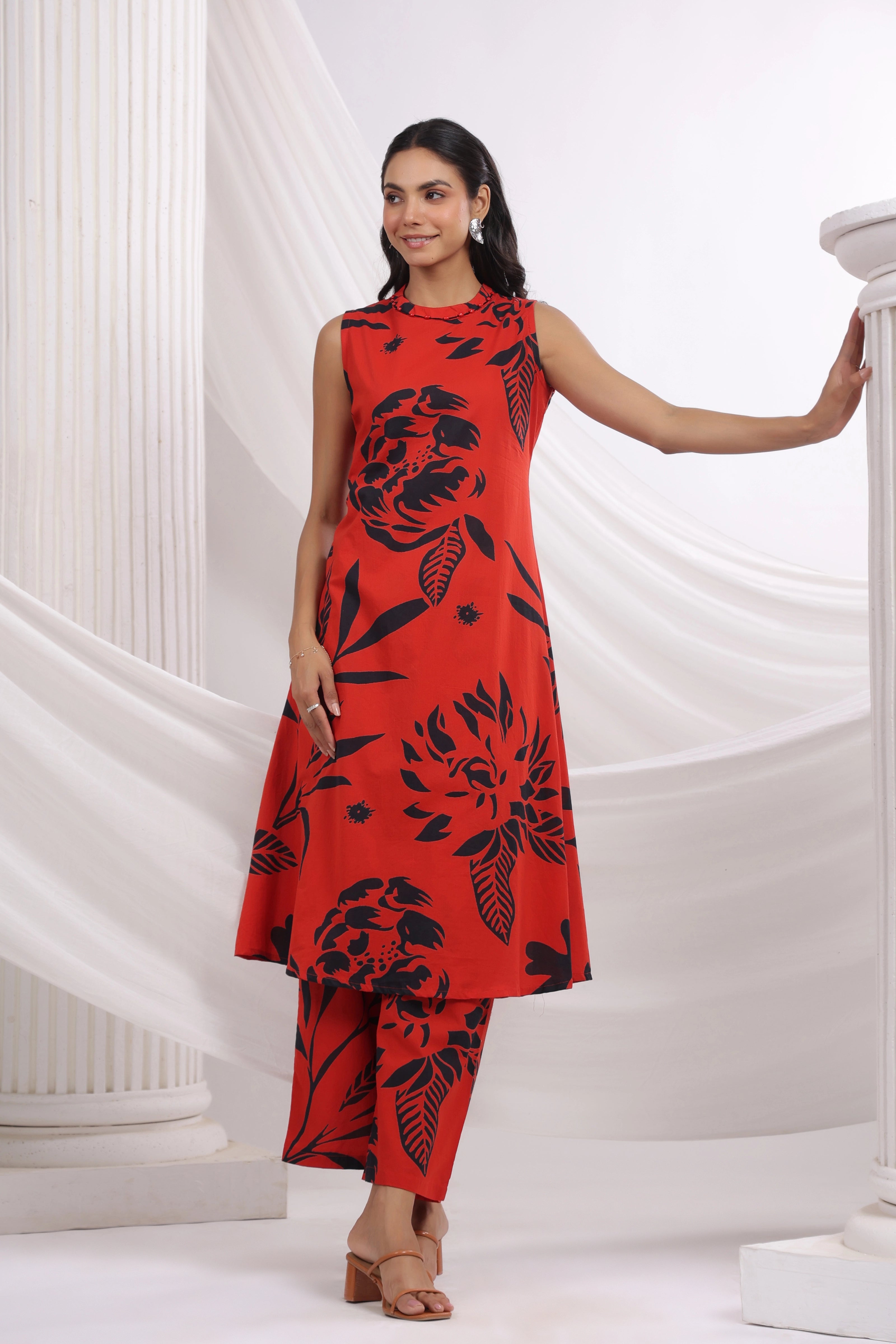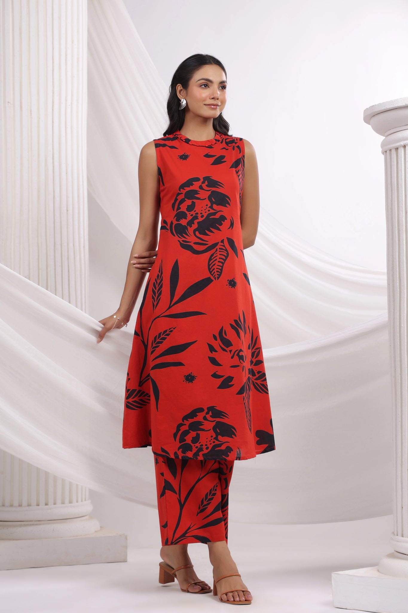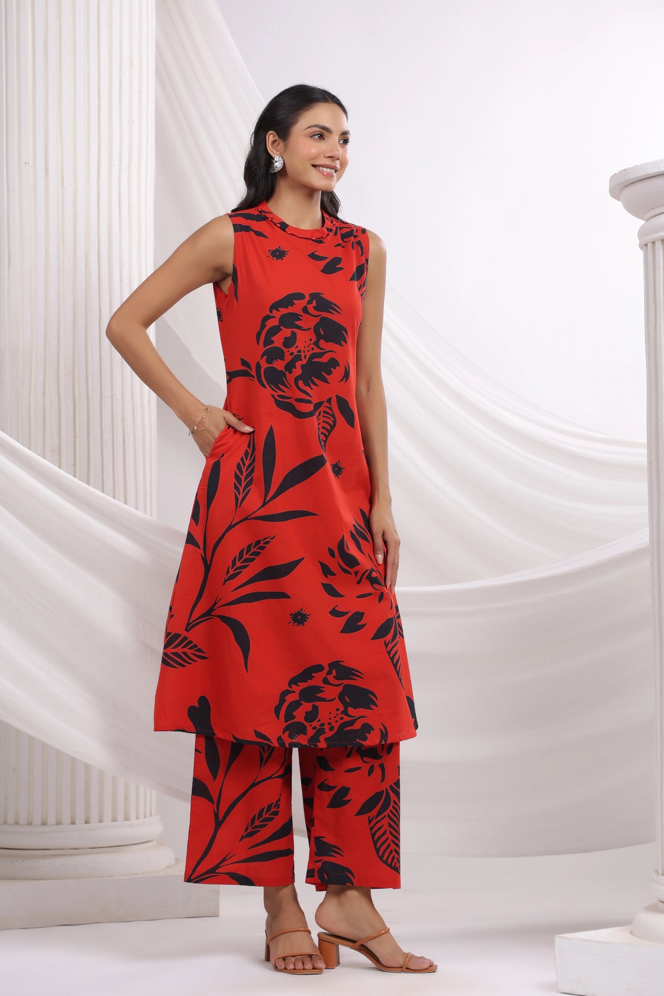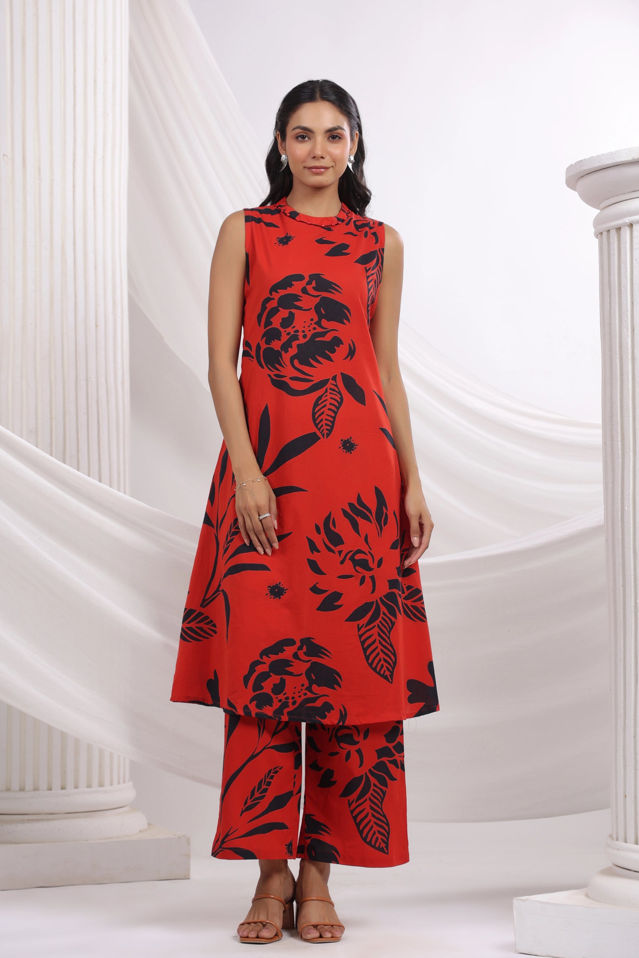 Make a confident statement with this Red Base Ethnic A-Line Kurta Set, adorned in black abstract bold floral prints. Designed in soft, breathable cotton, the kurta features a round neckline, sleeveless cut, and side pockets for added practicality. The look is elevated with delicate beads work detailing on the front and comes paired with wide leg pants, offering a graceful silhouette ideal for festive or day wear.