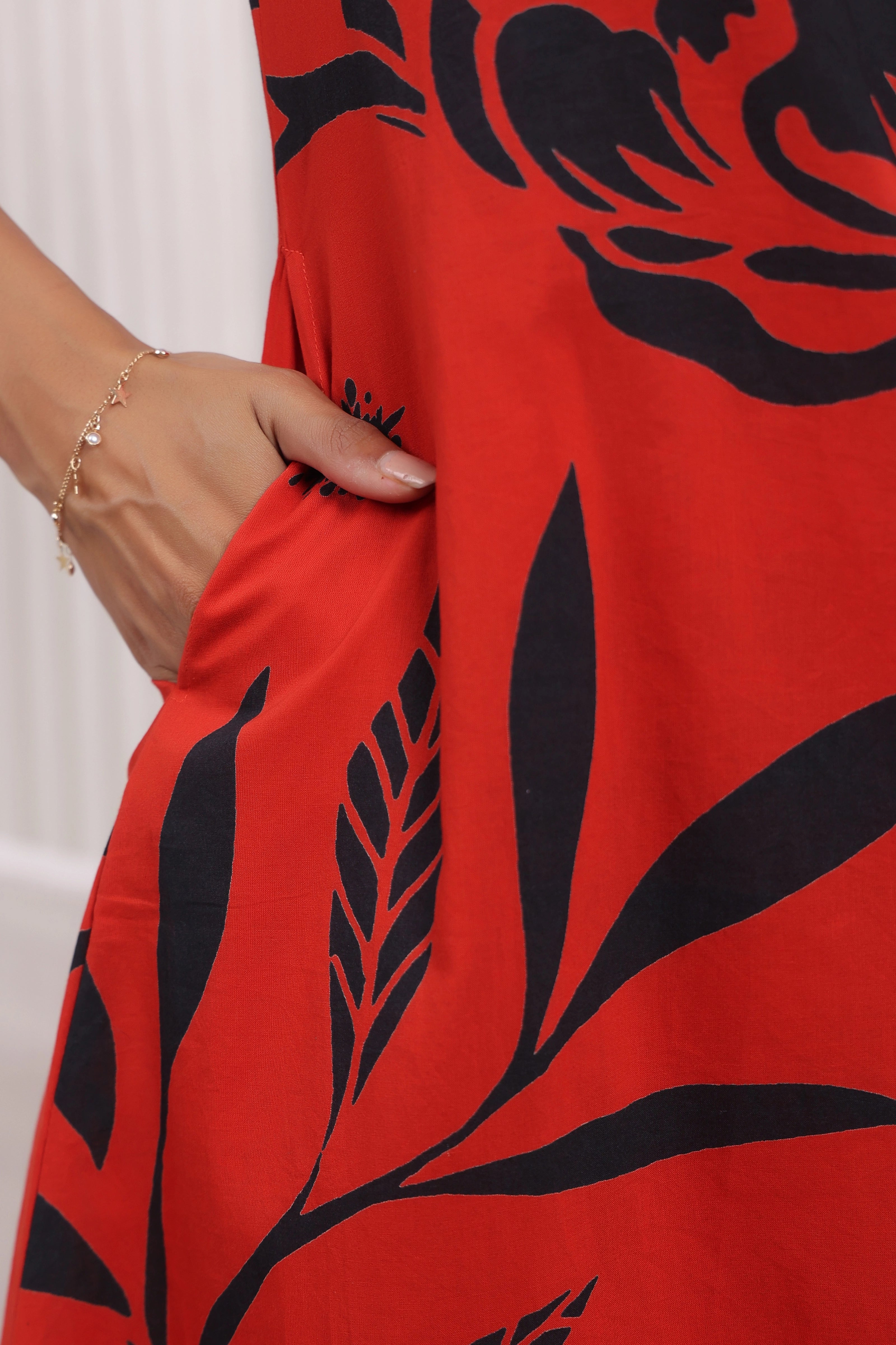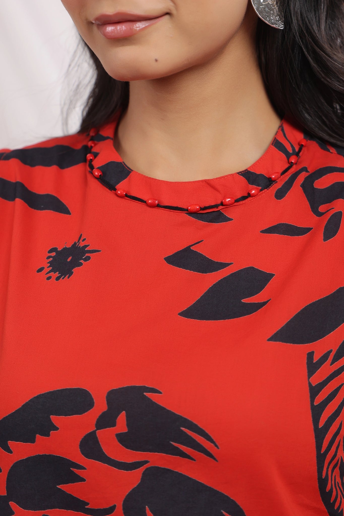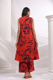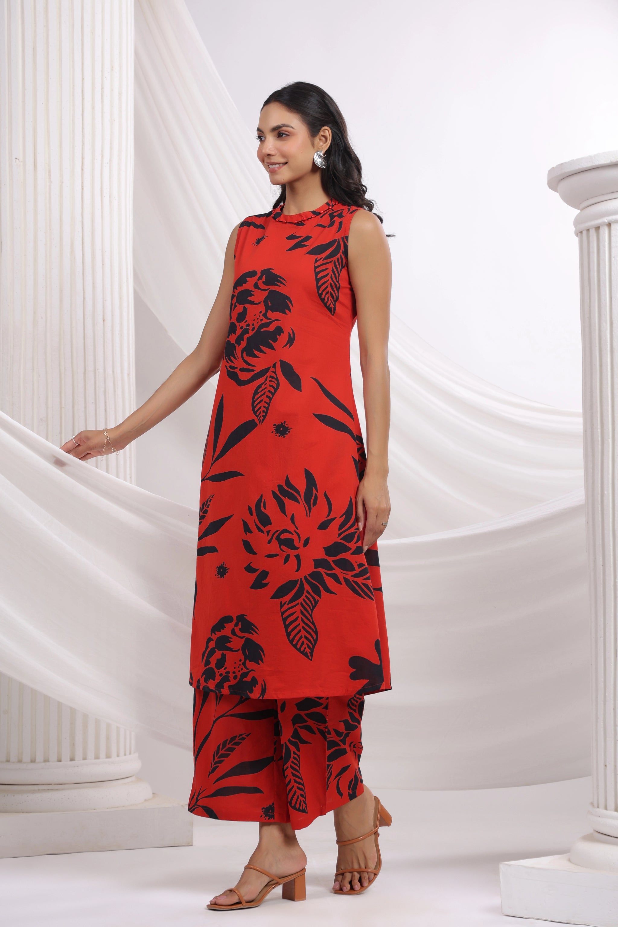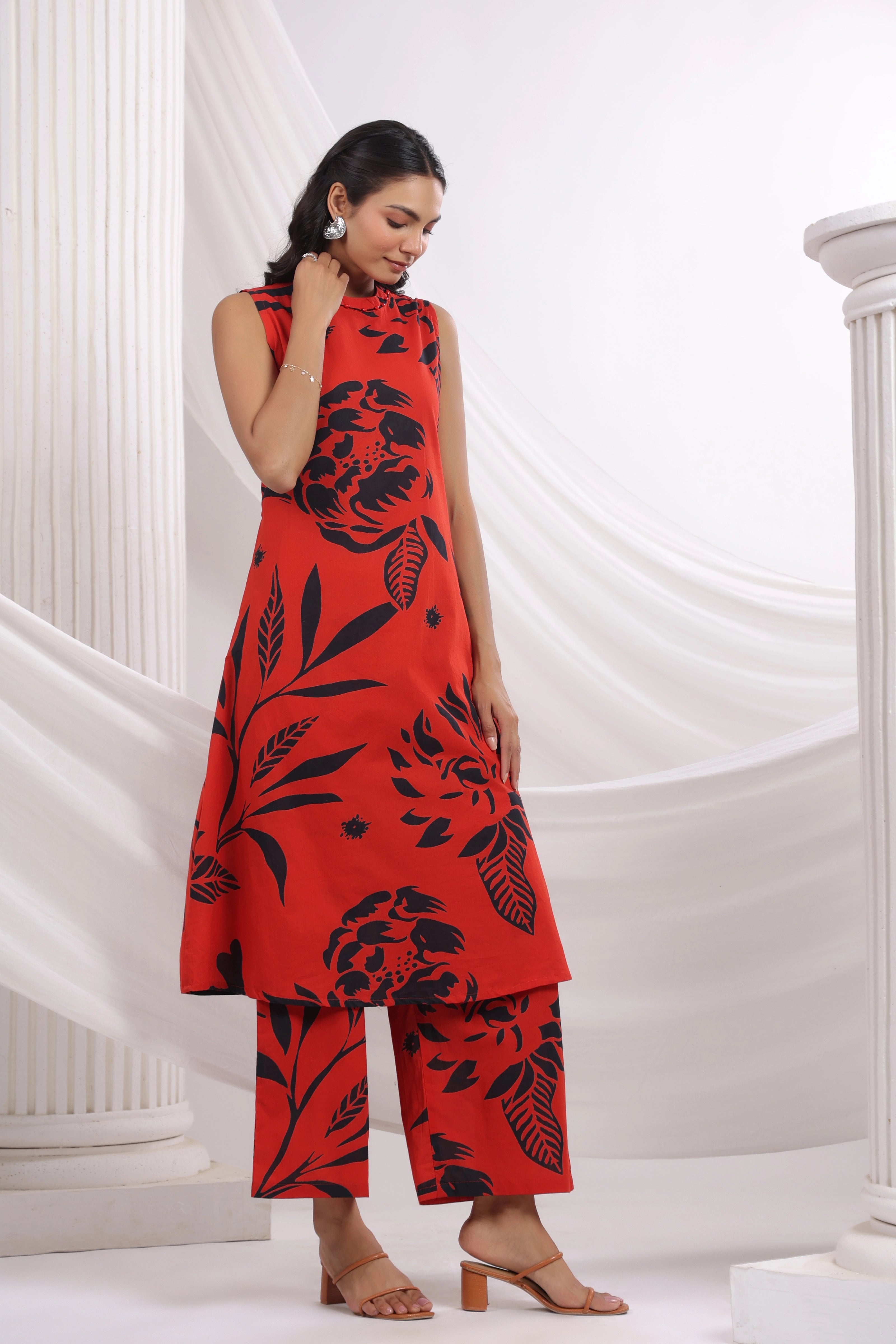 Make a confident statement with this Red Base Ethnic A-Line Kurta Set, adorned in black abstract bold floral prints. Designed in soft, breathable cotton, the kurta features a round neckline, sleeveless cut, and side pockets for added practicality. The look is elevated with delicate beads work detailing on the front and comes paired with wide leg pants, offering a graceful silhouette ideal for festive or day wear.