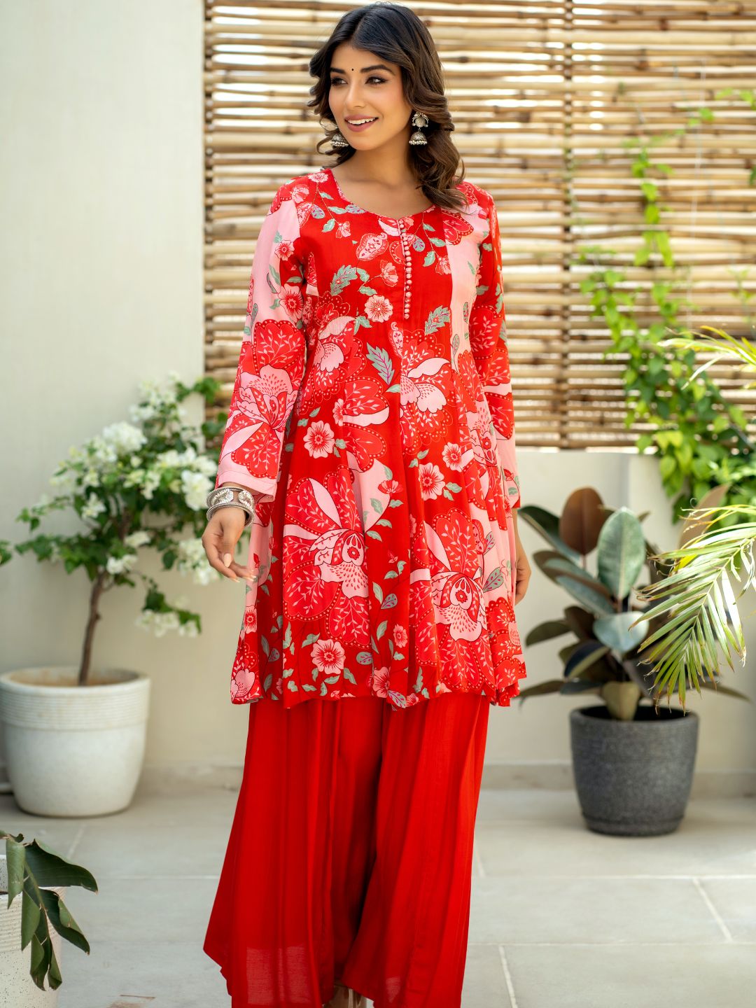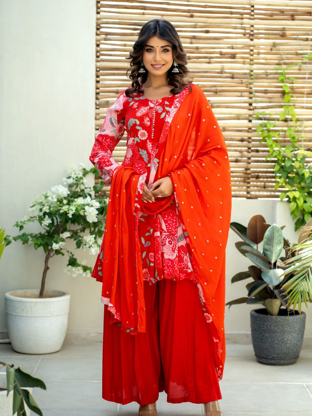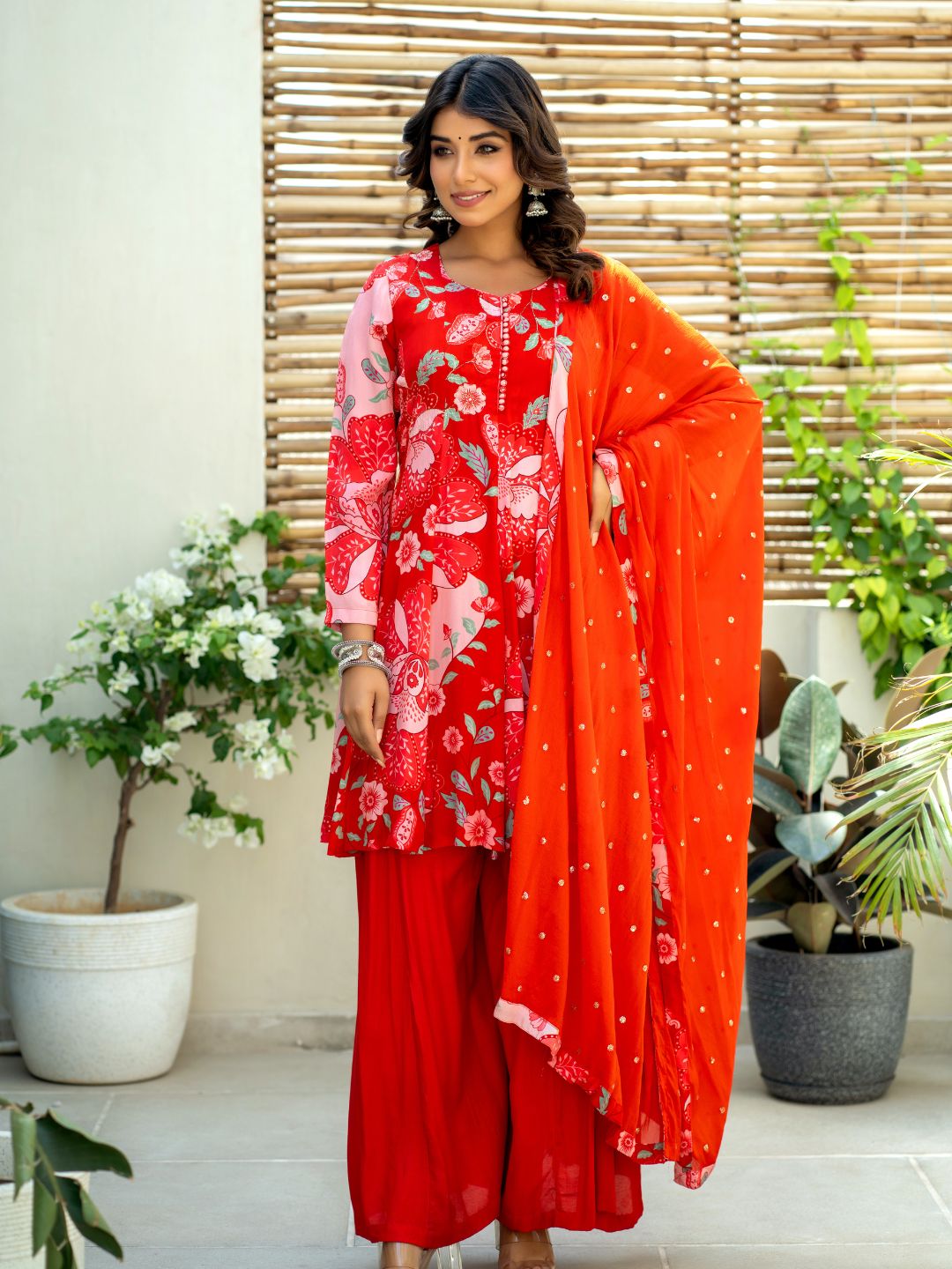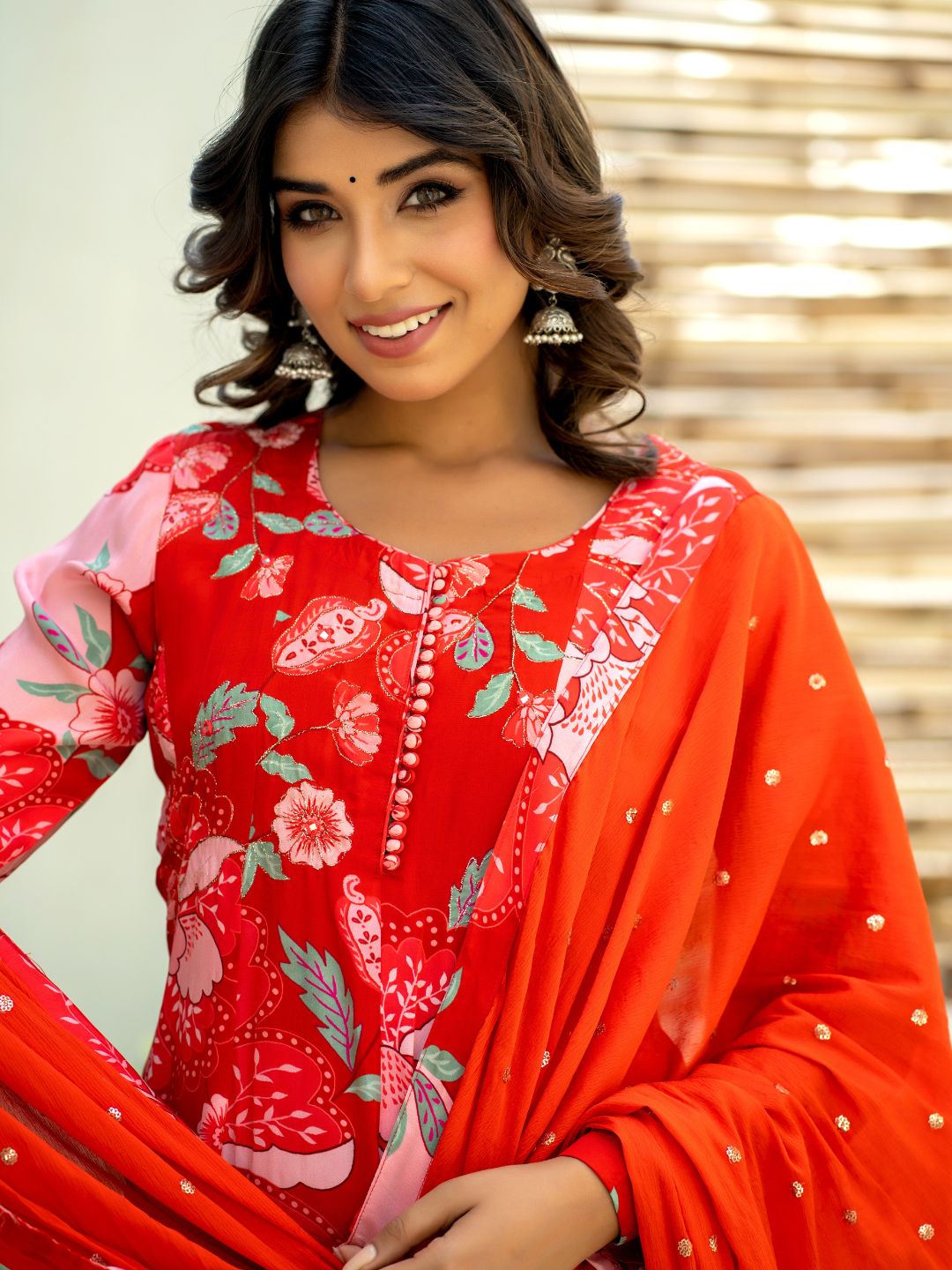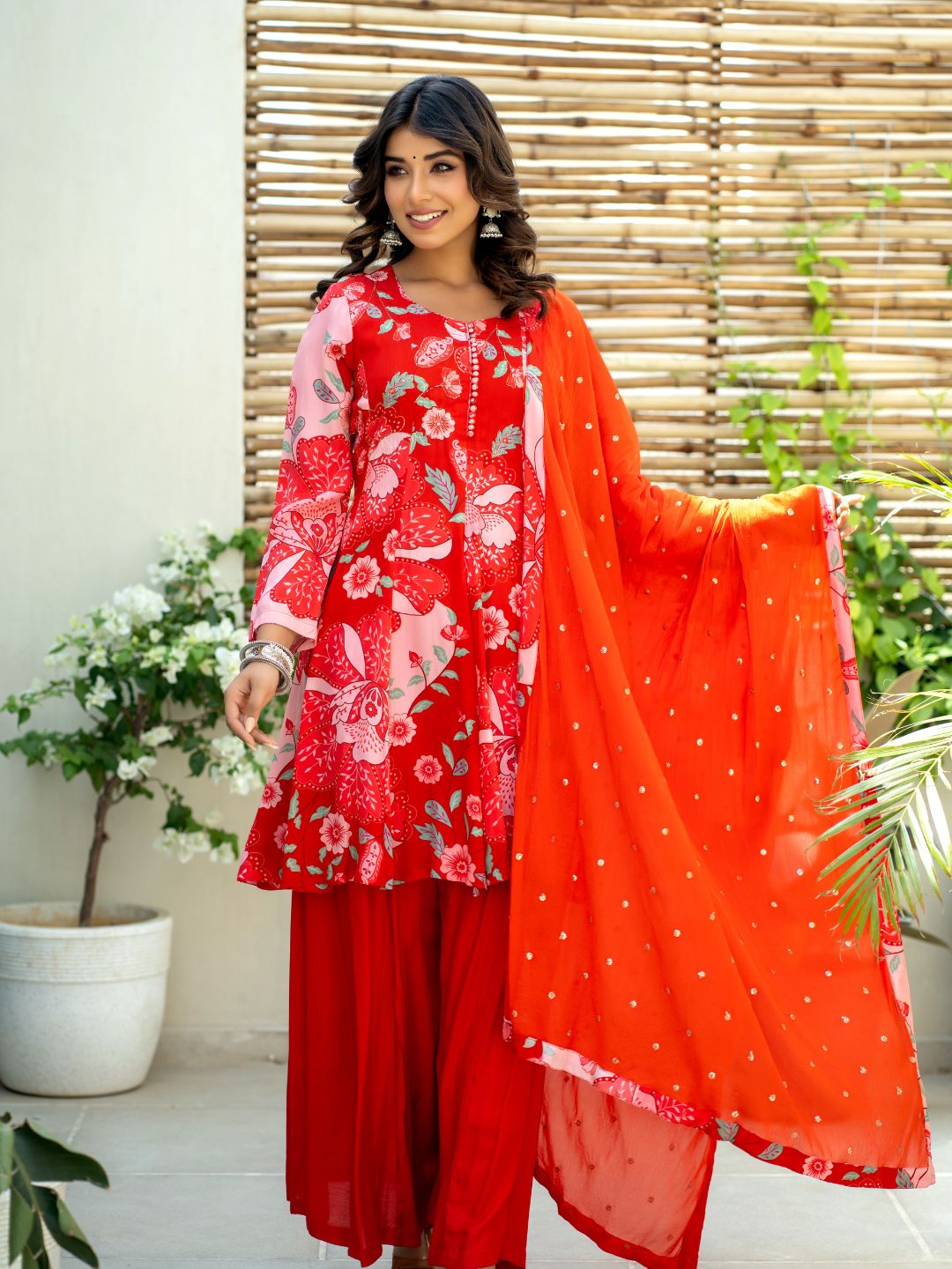 Red & Pink Floral Pure Crepe Ethnic Set with Dupatta Golden Thread Embroidery & Mirror Work