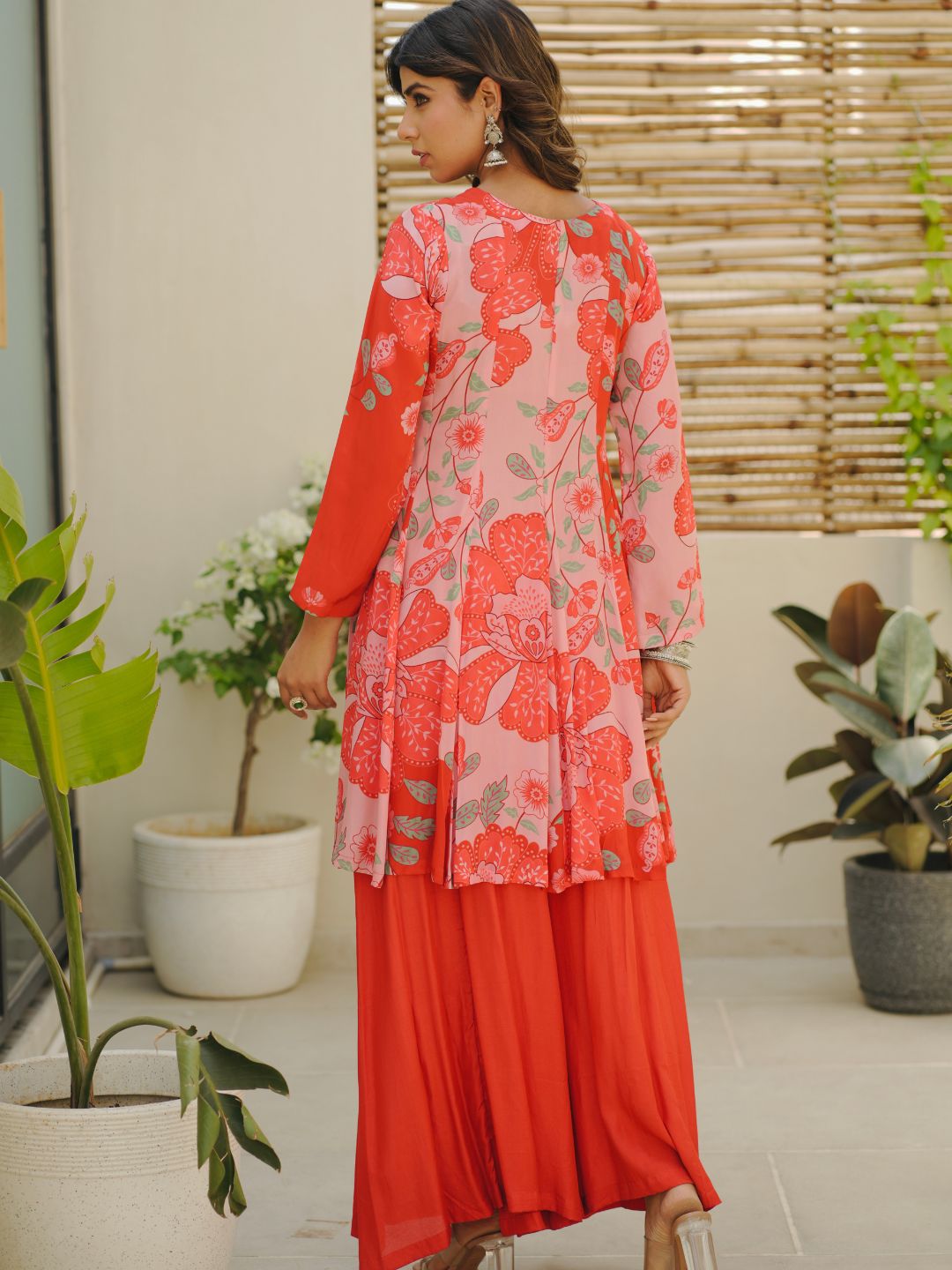Make a statement in the Red & Pink Floral Pure Crepe Ethnic Set, adorned with exquisite golden thread embroidery and mirror work that exudes timeless grace. The intricate detailing elevates the outfit, while the wide-leg silhouette ensures a flowy and elegant drape. The button-front design adds a refined touch, making it a perfect blend of tradition and modernity.