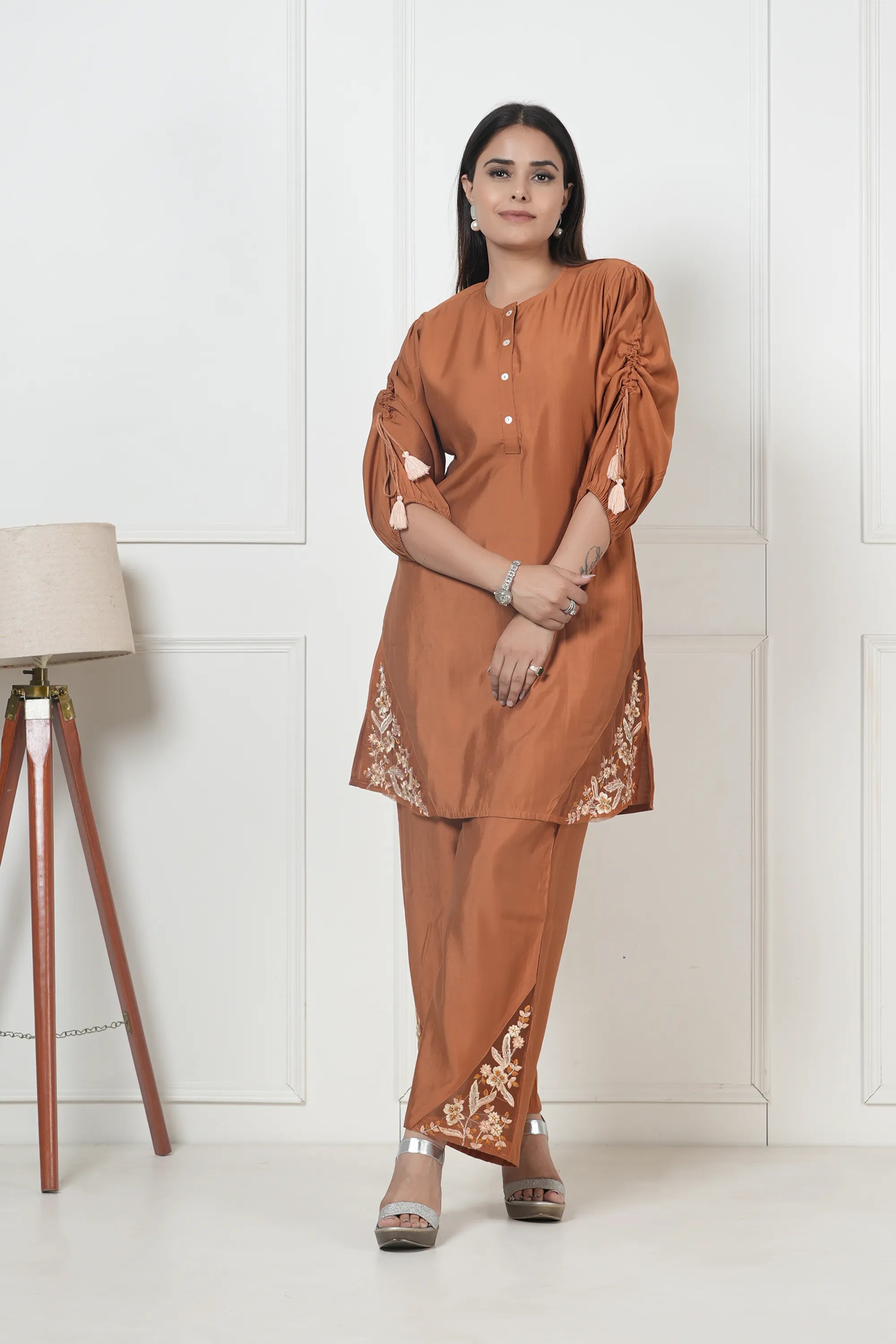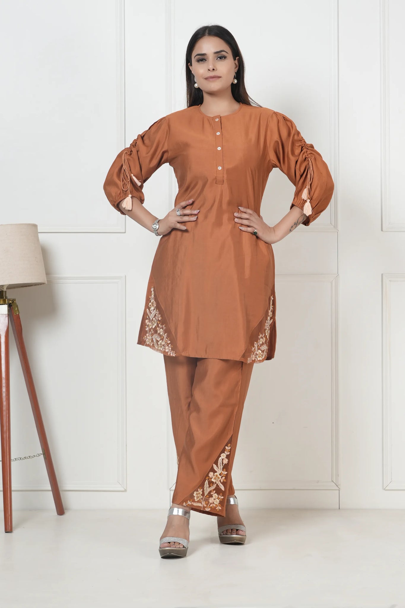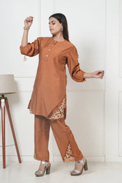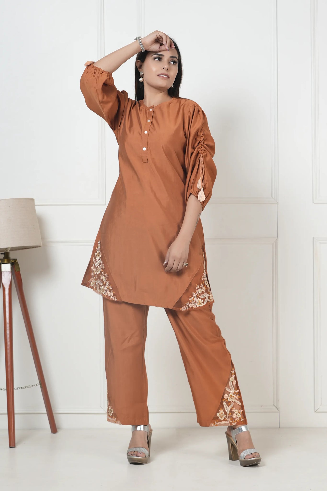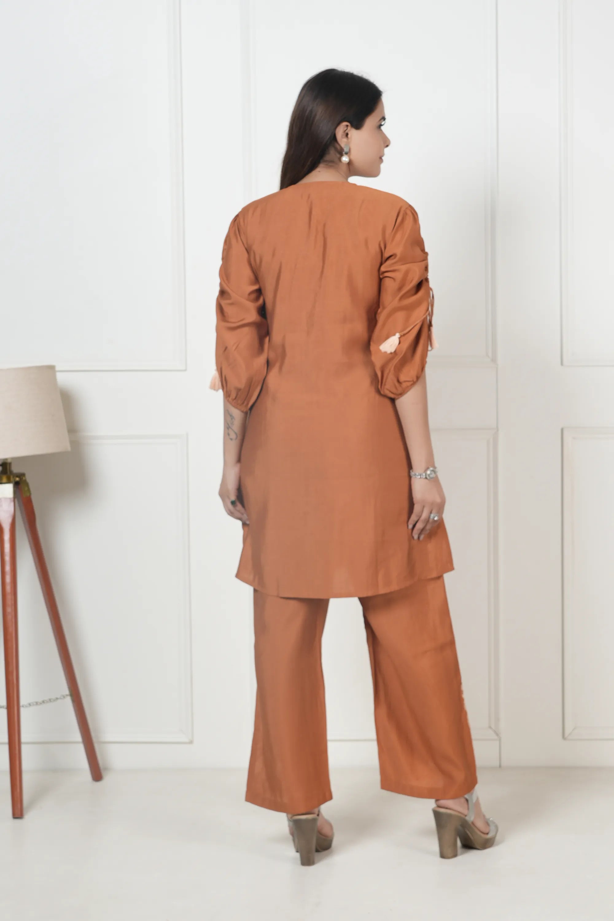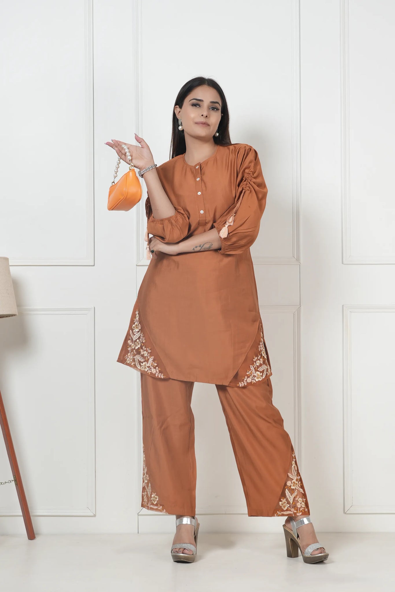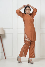 Chic Elegance: Rust Orange Embroidered Tunic with Straight Pant