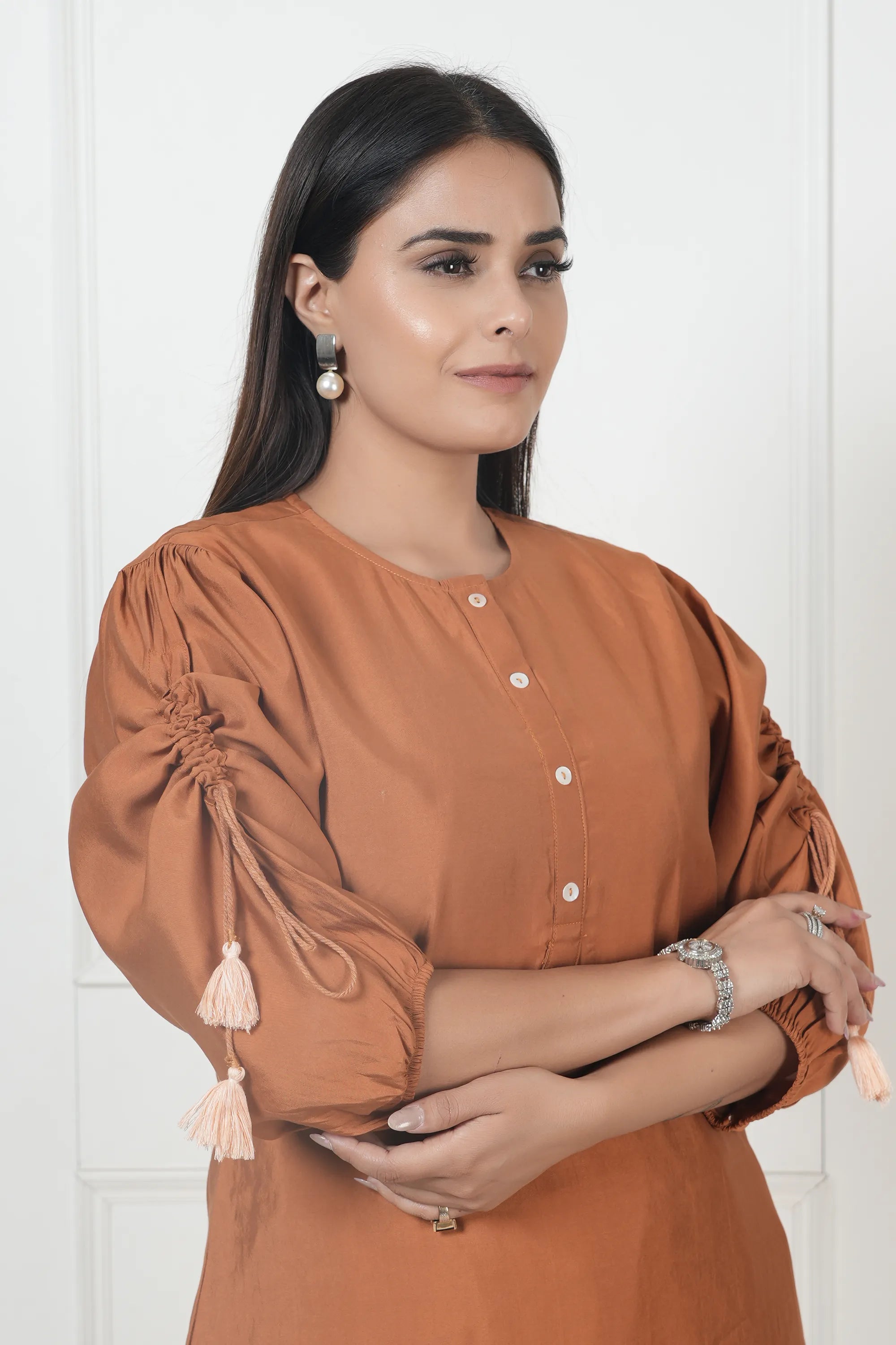 • Top: Rust Orange Tunic with Embroidered Threadwork and Puff Sleeves