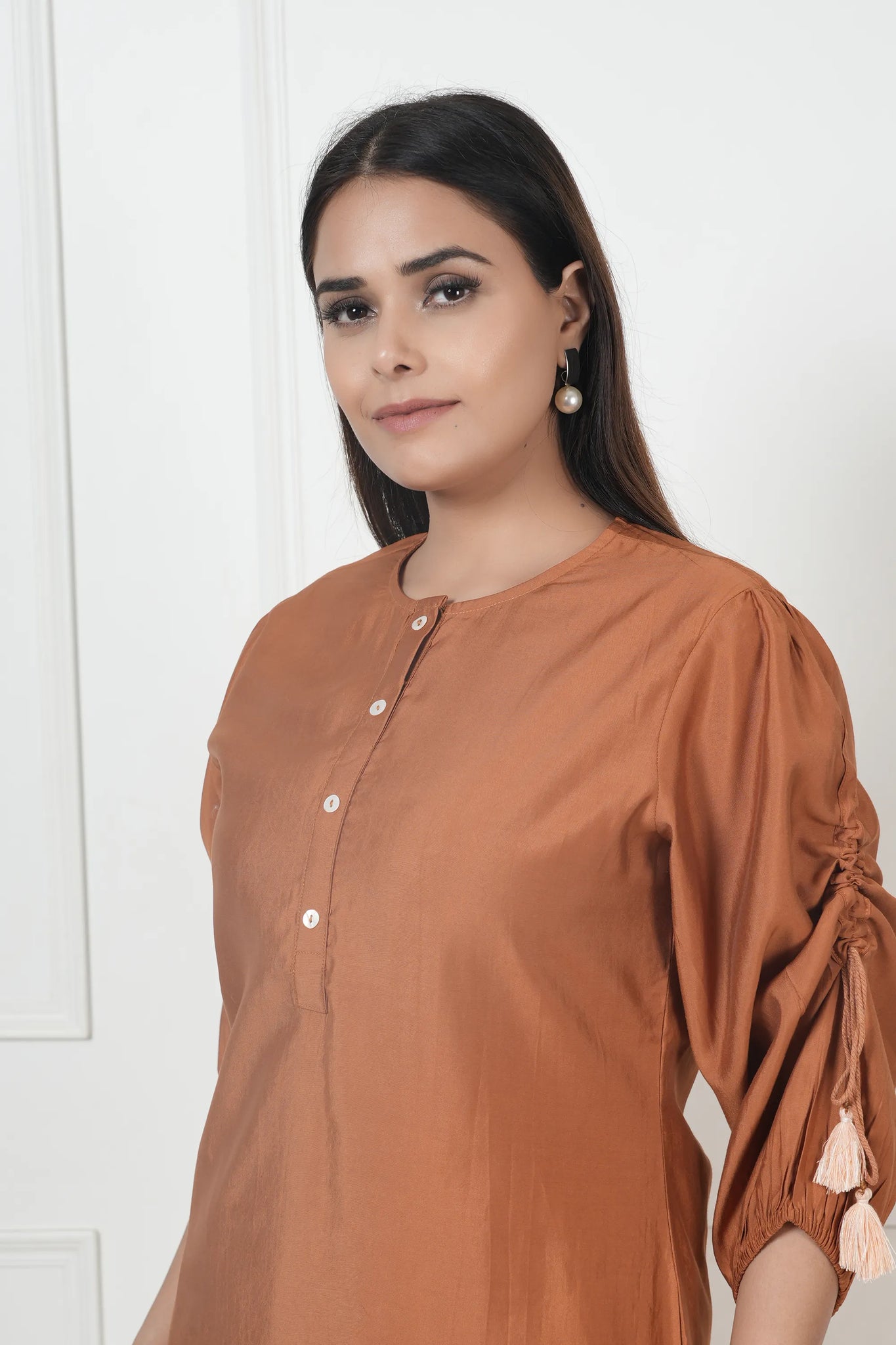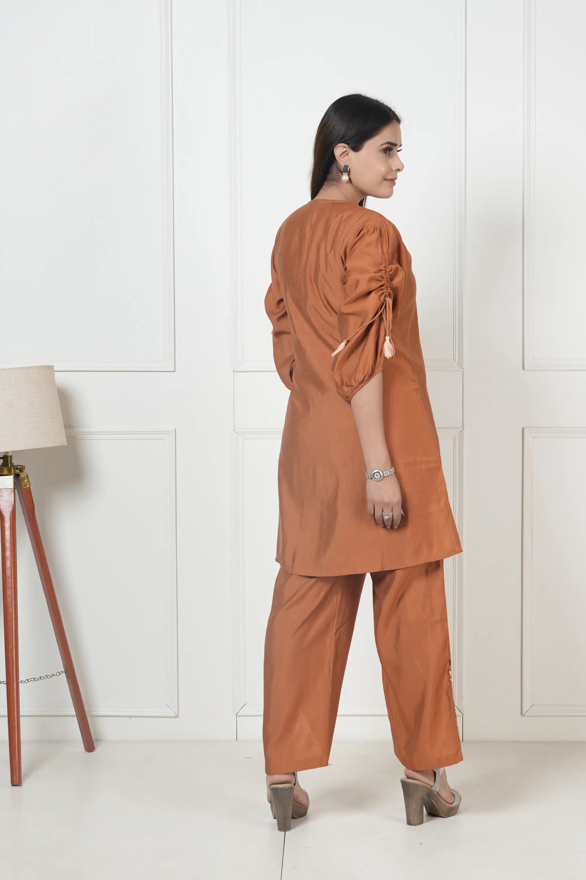 Embrace a blend of vibrant color and intricate details with the Rust Orange Embroidered Tunic with Straight Pant. This ensemble features a stunning rust orange tunic, adorned with delicate embroidered threadwork and flattering puff sleeves. Paired with sleek, straight pants in smooth viscose fabric, it offers both comfort and sophisticated style, ideal for any occasion.