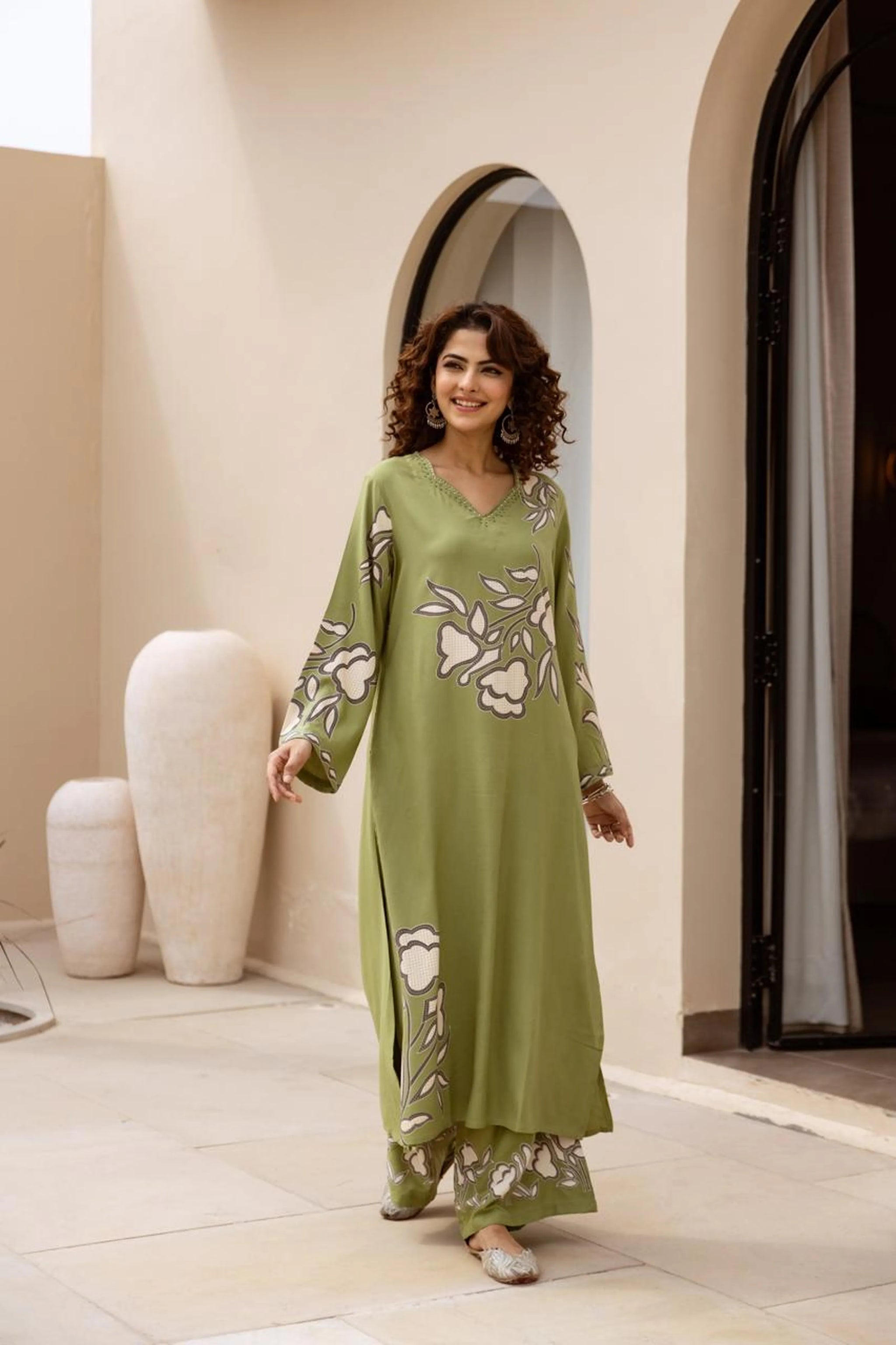 Serene Bloom: Sage Green Floral Placement Kurta-Palazzo Set with Sequin Detail in German Rayon