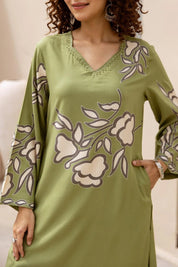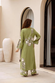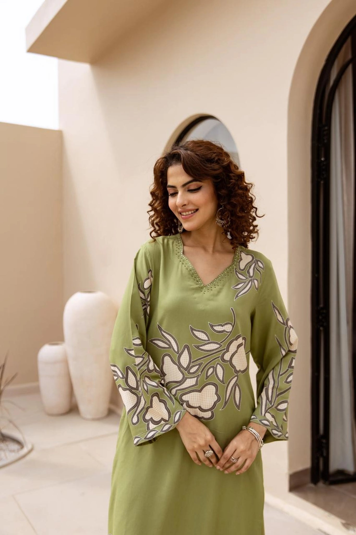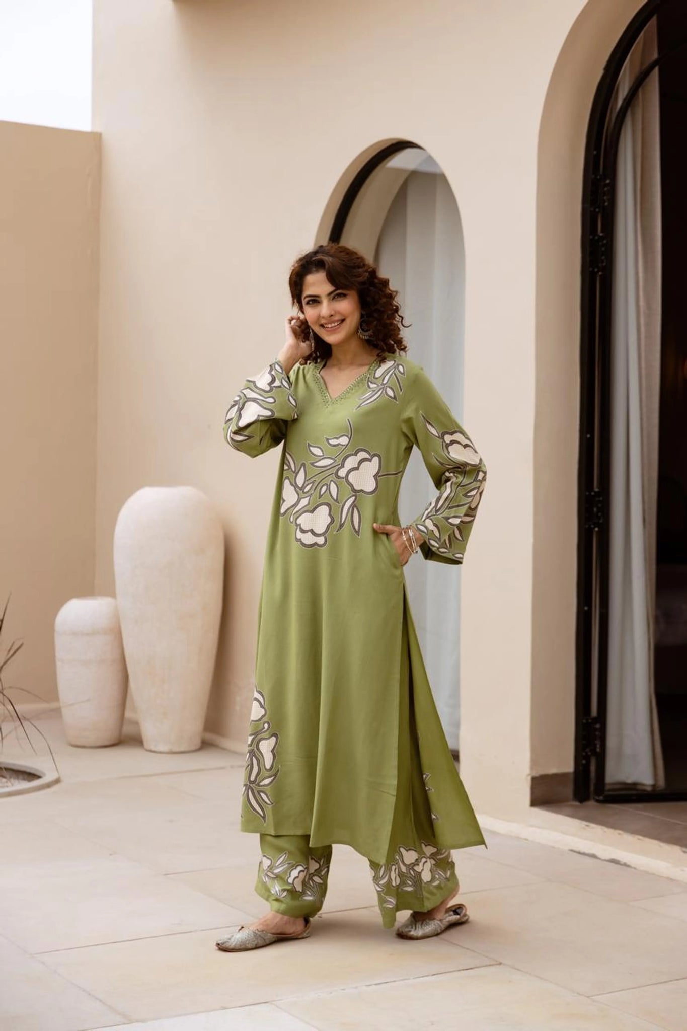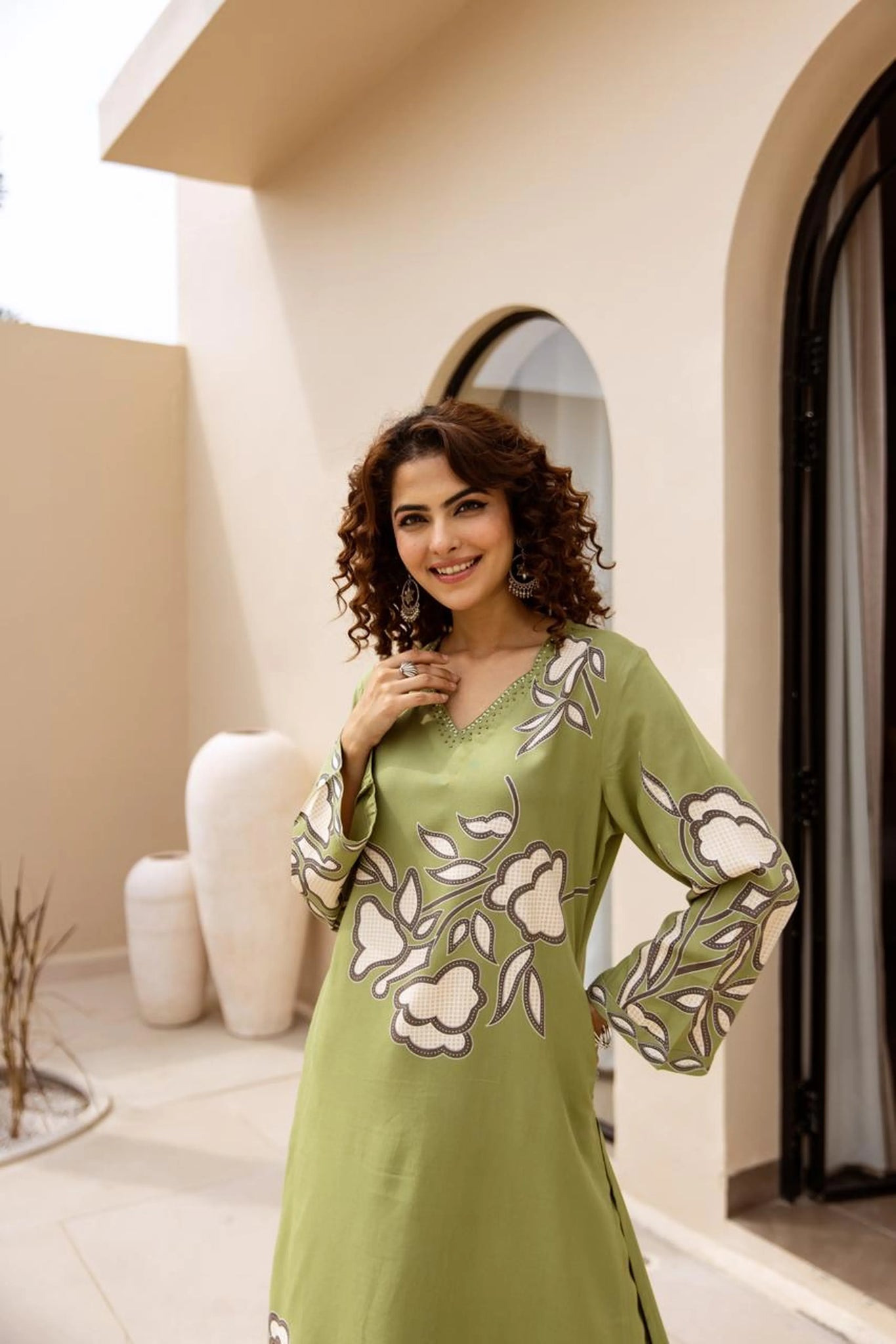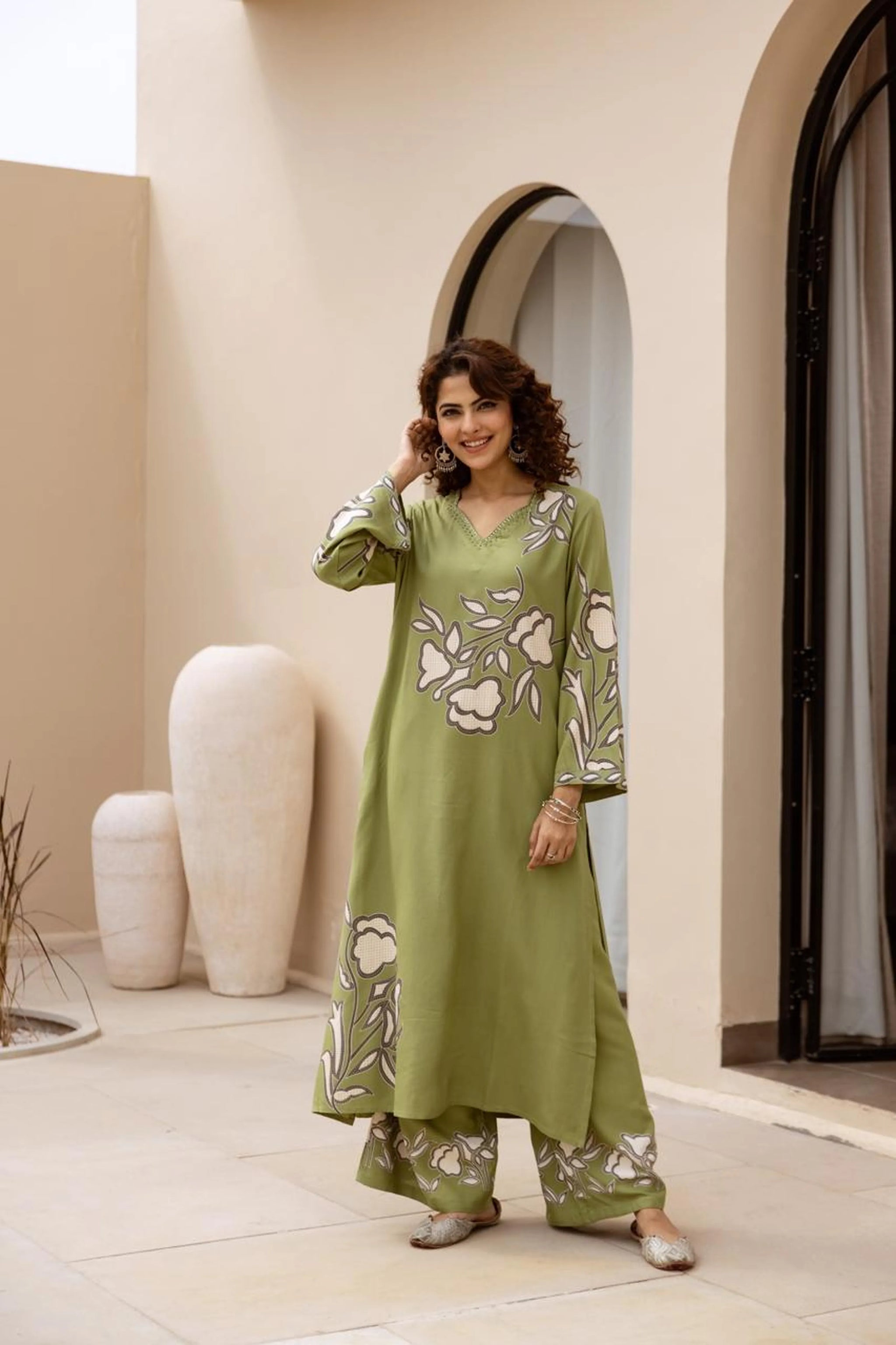 Rooted in grace and elevated with artisanal charm, this sage green kurta-palazzo set is a visual poem in every thread. Crafted from flowy German rayon, it offers an elegant drape with a breathable feel—perfect for warm-weather celebrations and relaxed festive dressing.