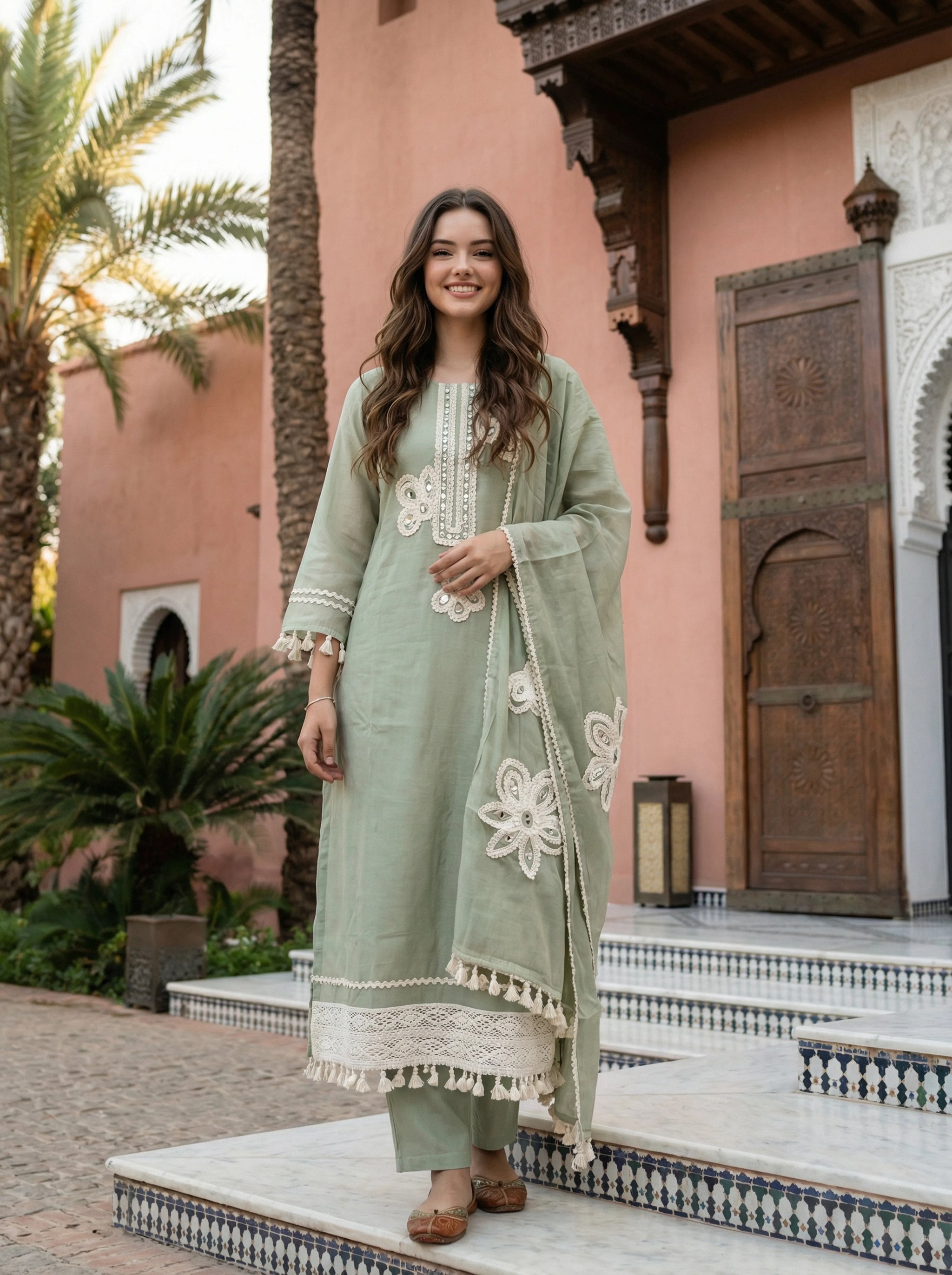 Paired with straight-fit plain pants, the ensemble maintains a clean and balanced silhouette, allowing the intricate detailing to take center stage. Completing the look is a coordinated Mal Chanderi dupatta, adorned with delicate lace borders, tassels, and floral appliqué elements that flow gracefully with every step.