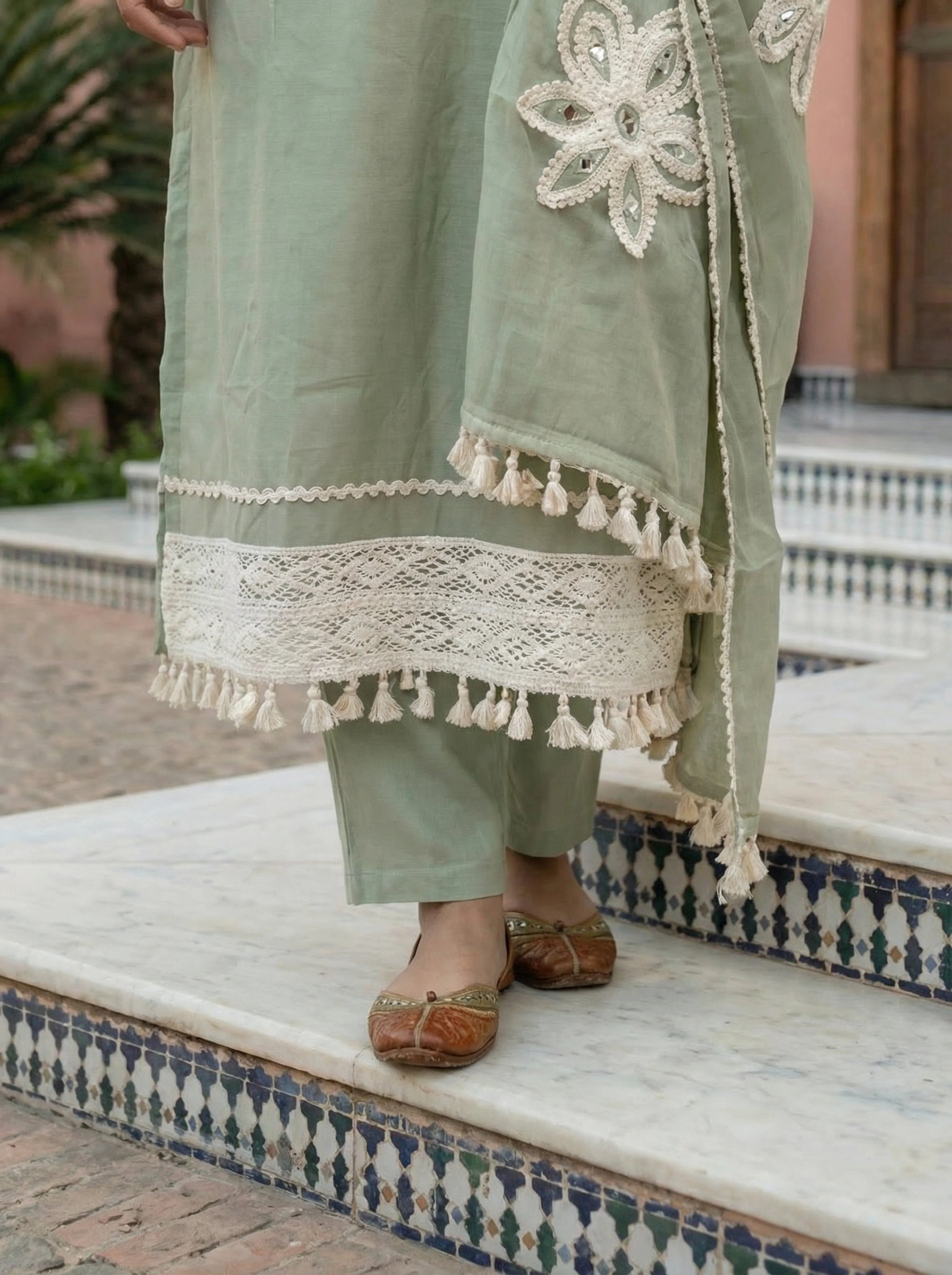 • Dupatta: Coordinated Mal Chanderi dupatta with lace borders, tassels & appliqué detailing