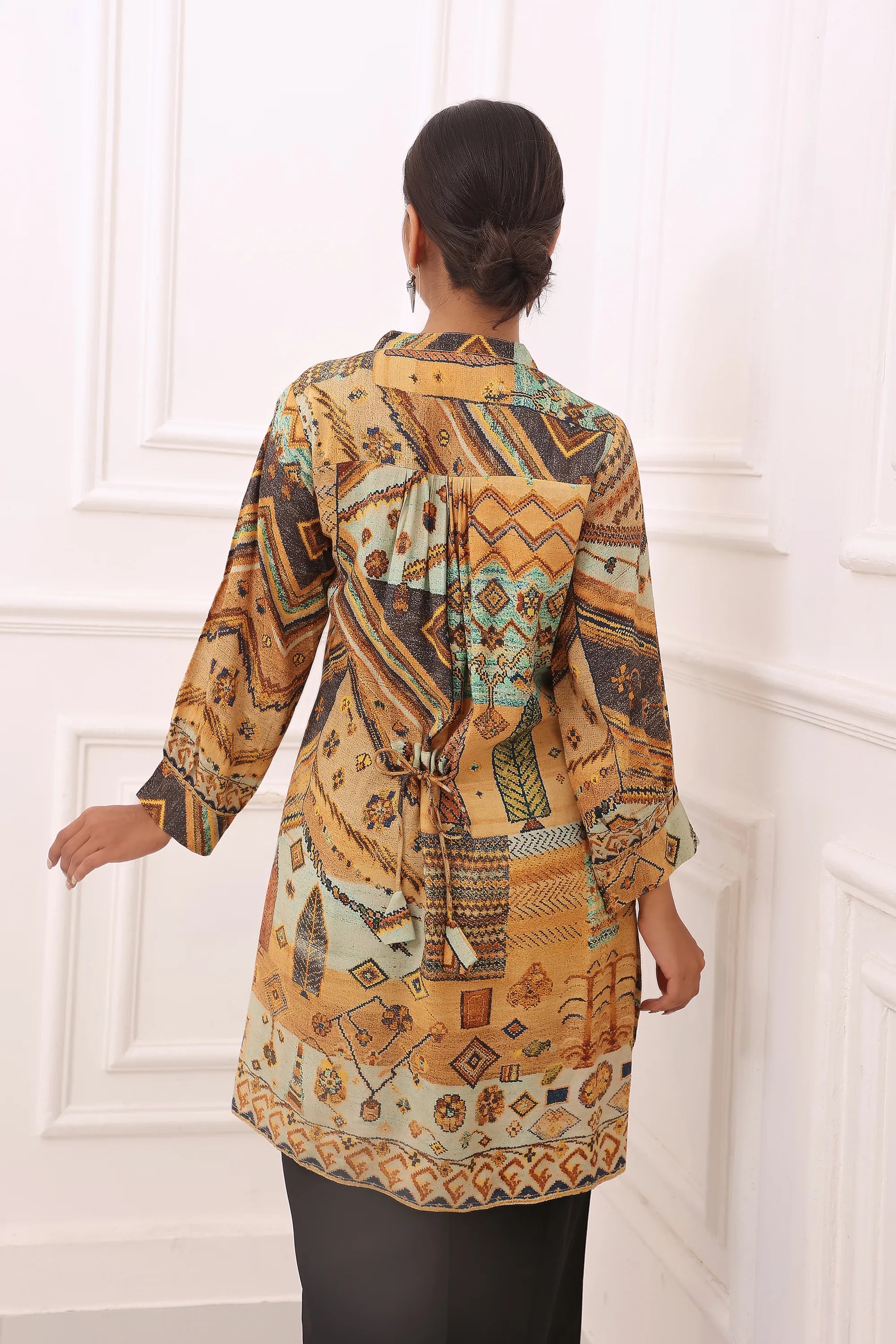 Made from soft muslin fabric, this tunic features a mandarin collar, full sleeves, and a convenient button closure. The high-low hem adds an elegant twist, and the tie-up detail at the back creates a flattering silhouette.
