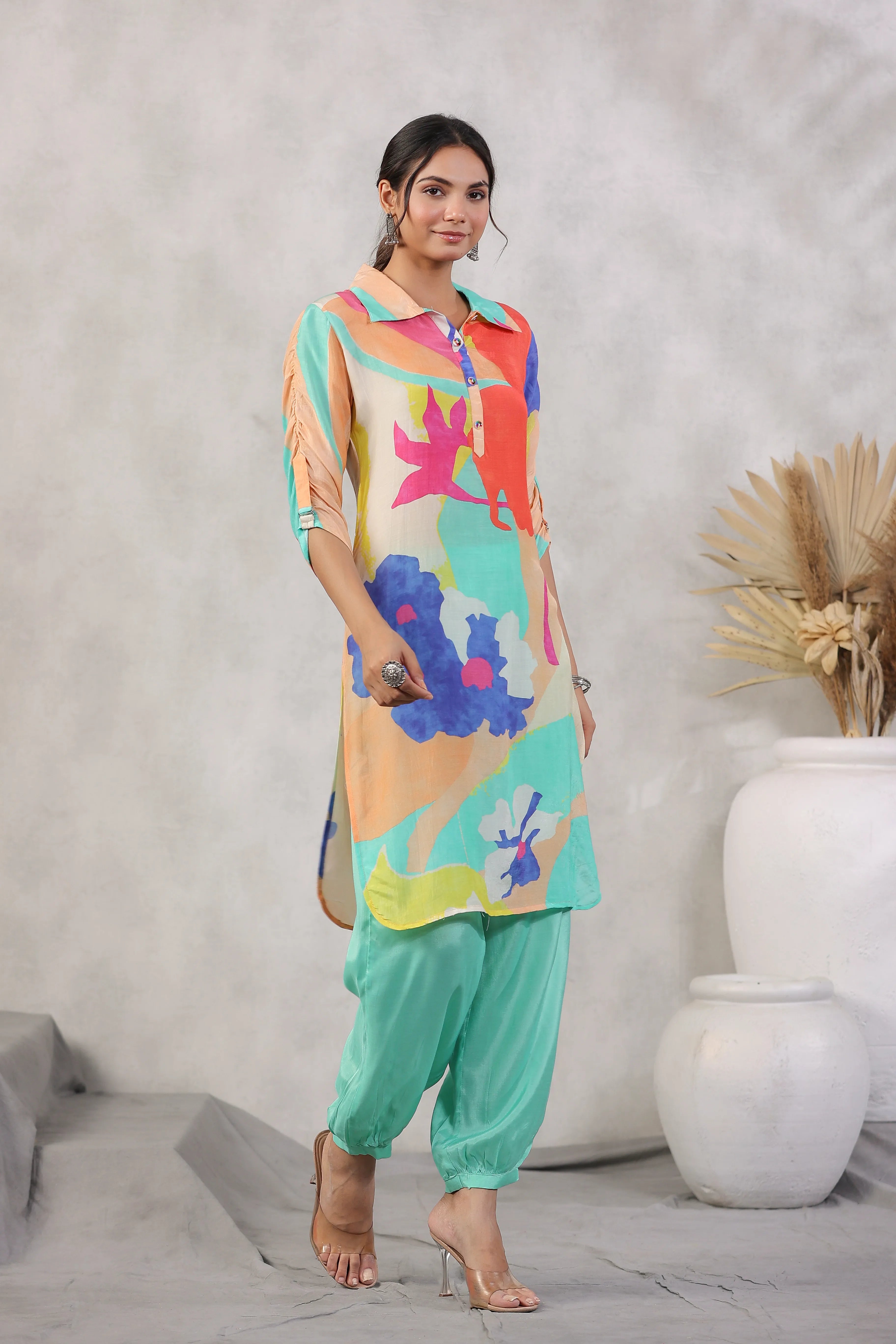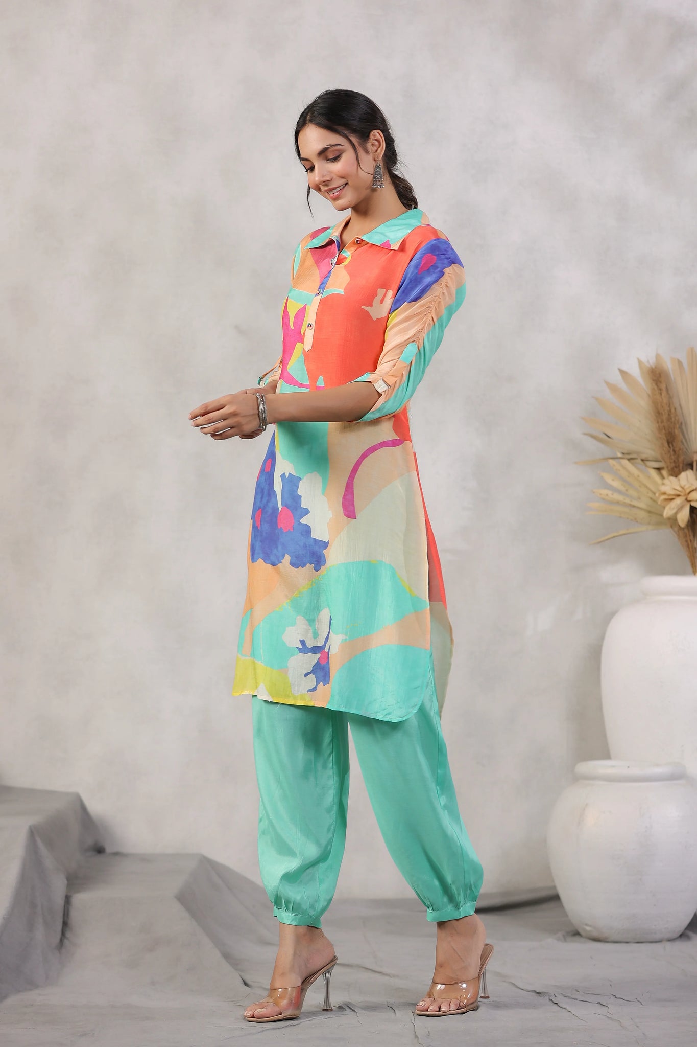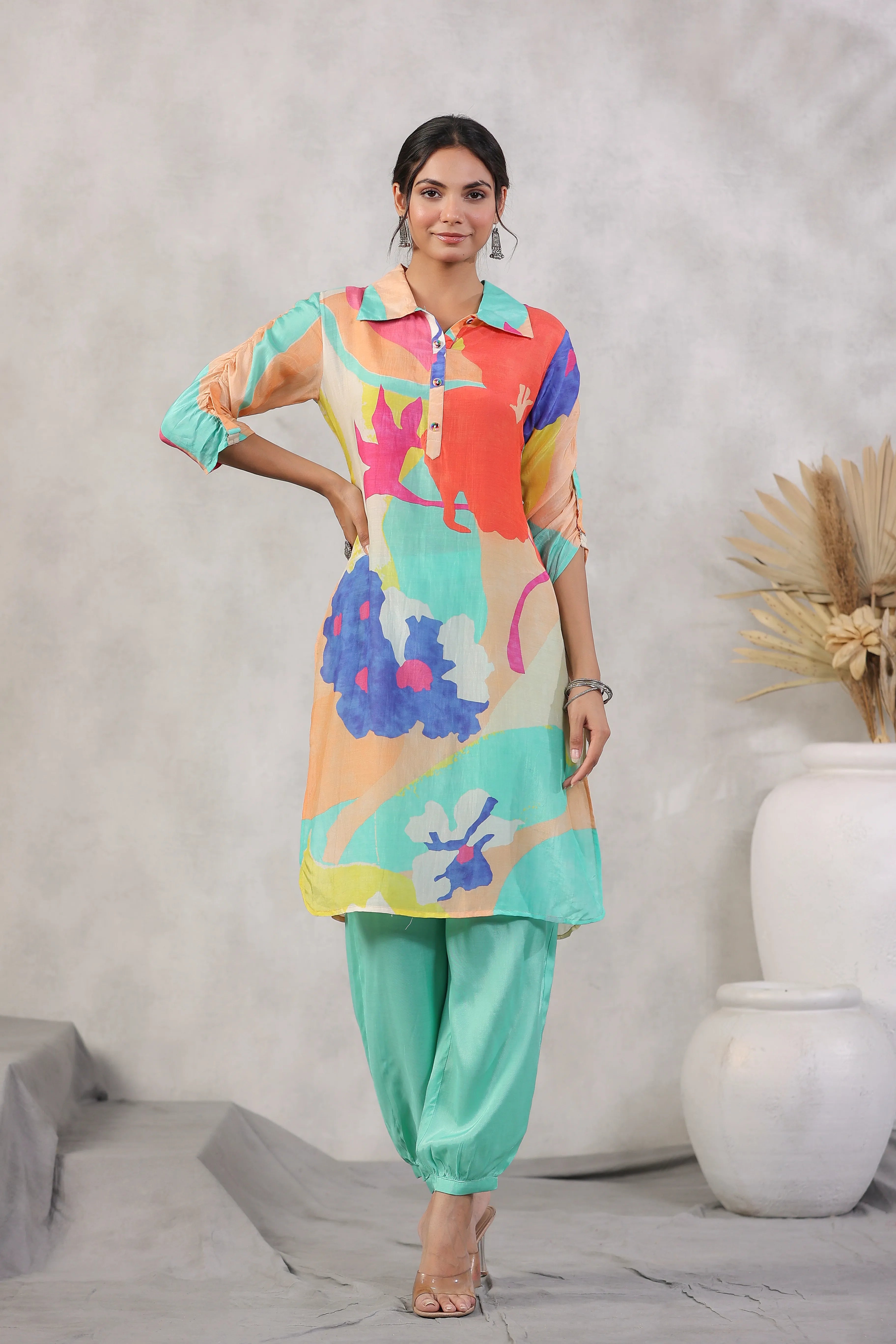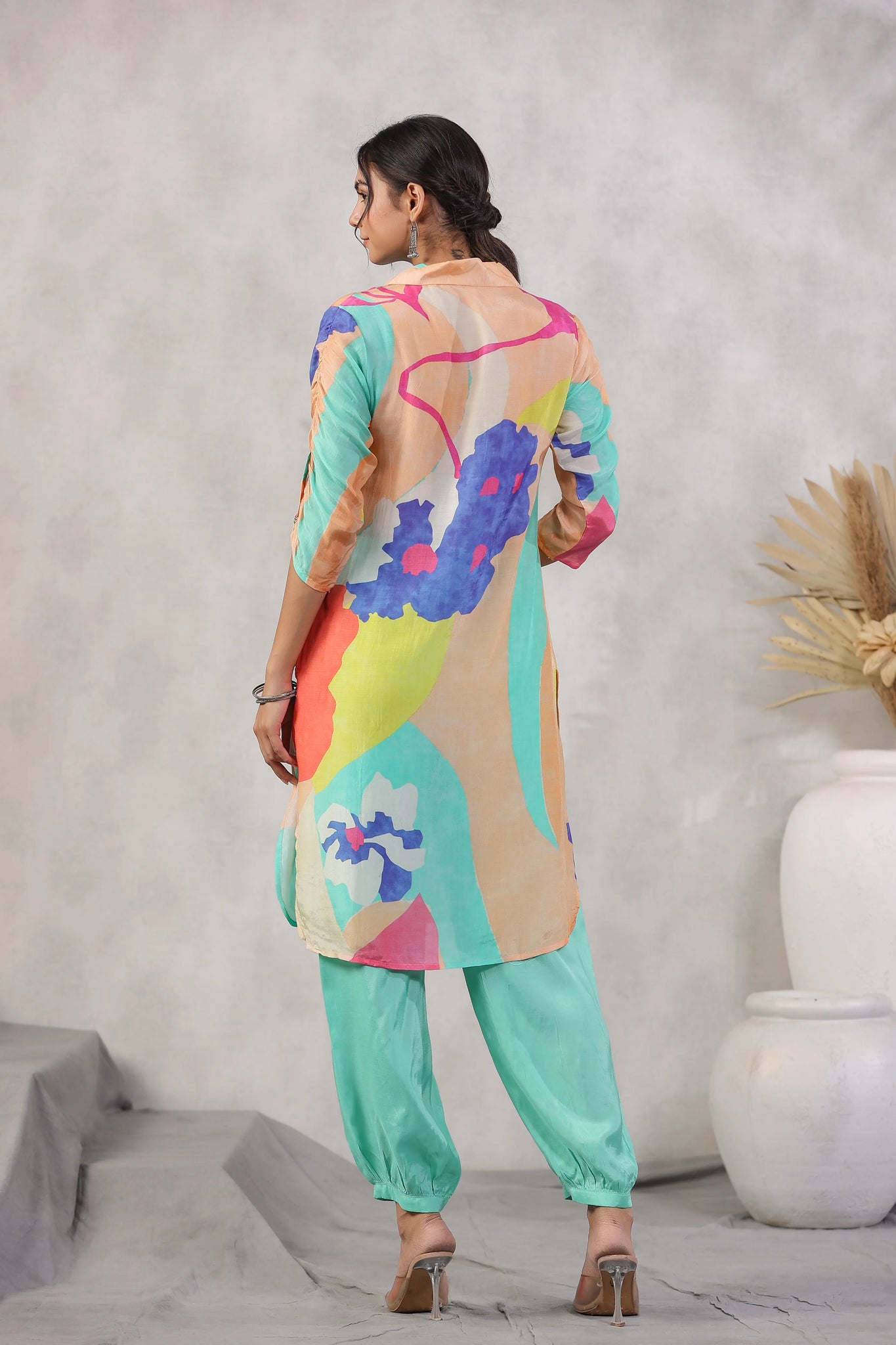 Contemporary Grace: Sea Green Abstract Printed Shirt-Style Kurta Set with Indo-Western Tulip Salwar