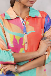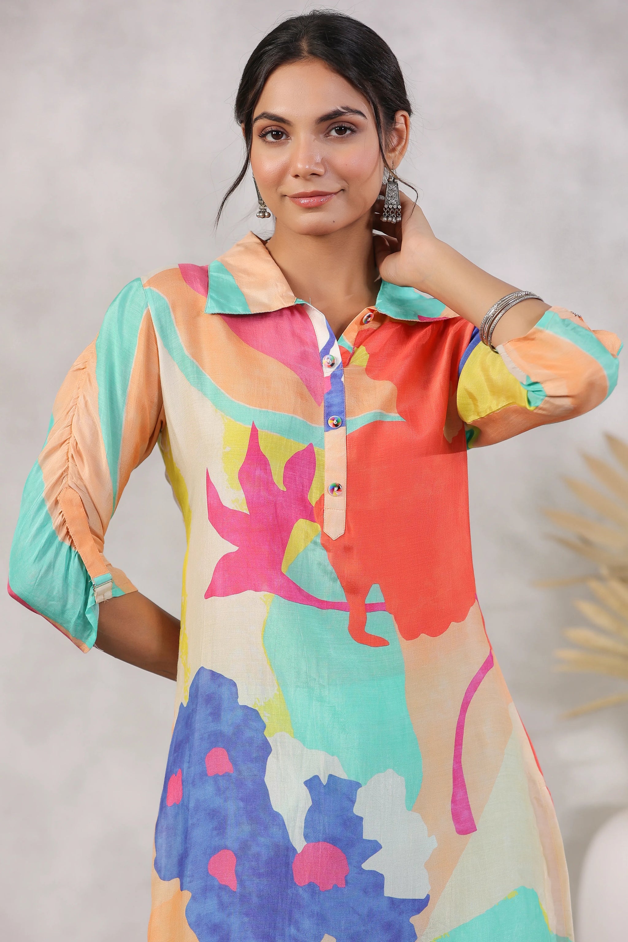 Redefine elegance with the Sea Green Abstract Printed Shirt-Style Kurta Set, a stunning fusion of modern design and traditional charm. Crafted from soft muslin fabric, the kurta showcases a vibrant abstract print, a structured collared neck, and a front faux button placket. The ruched 3/4th sleeves add a stylish touch, while the knee-length apple-cut silhouette ensures a flattering fit.