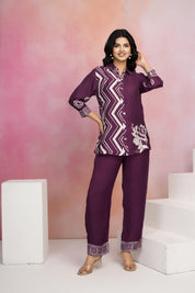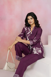 Step into modern sophistication with this violet co-ord set, where bold patterns meet timeless elegance!