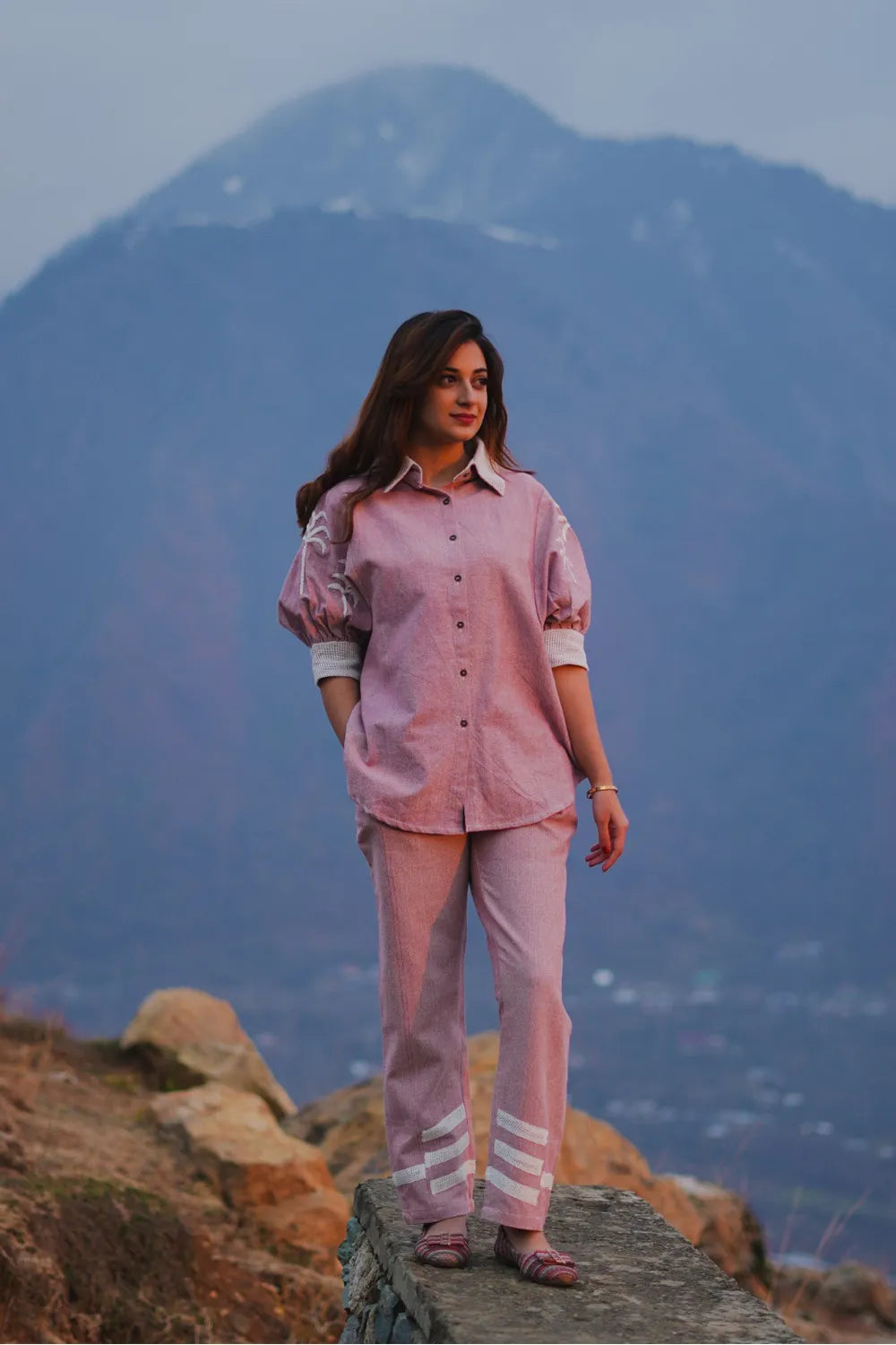 Elevate your wardrobe with this graceful blush pink co-ord set, where delicate embroidery meets timeless sophistication!
