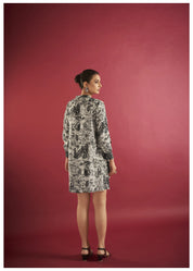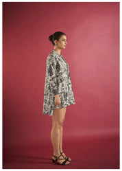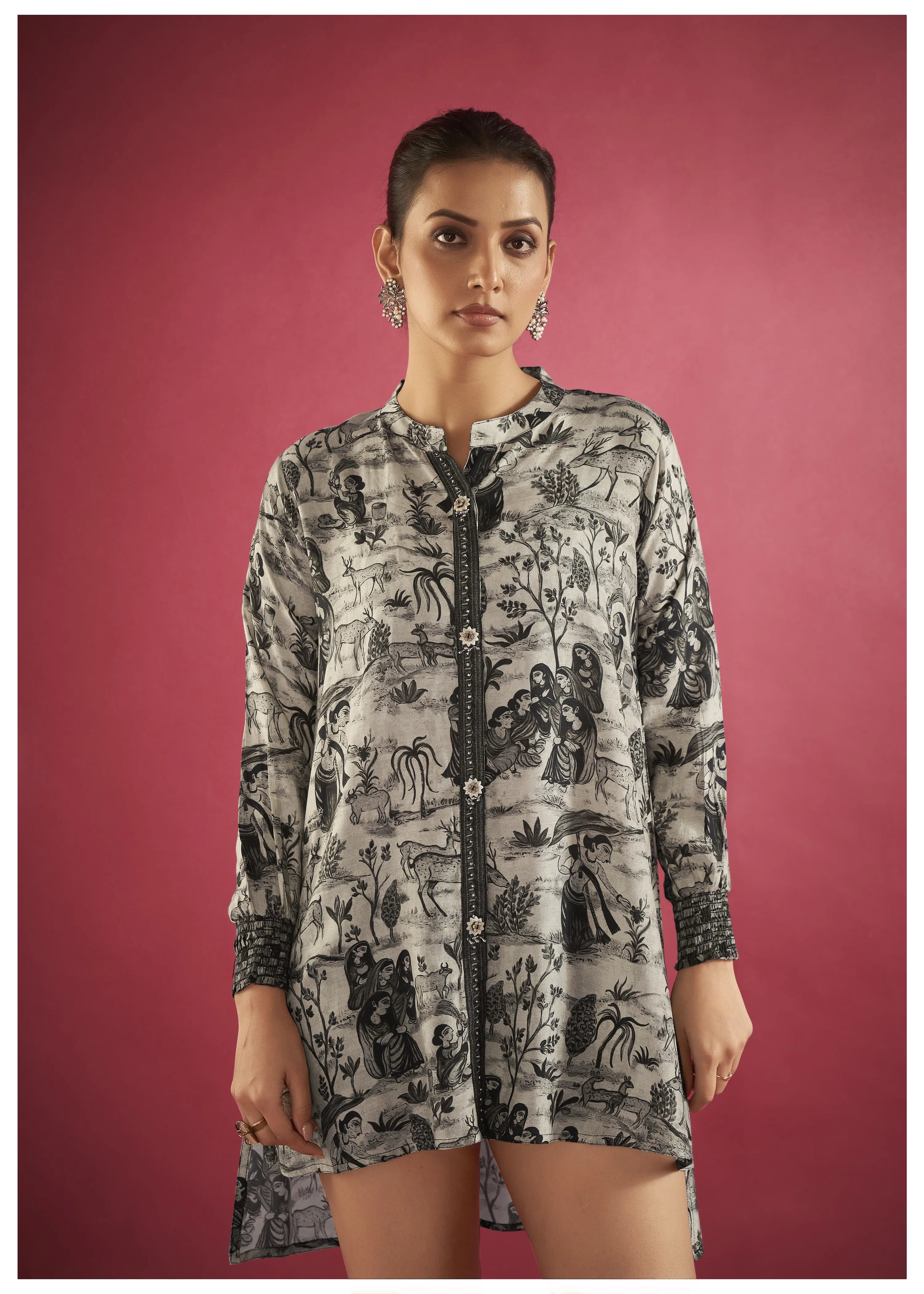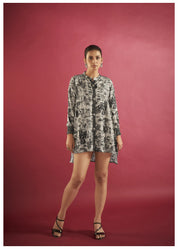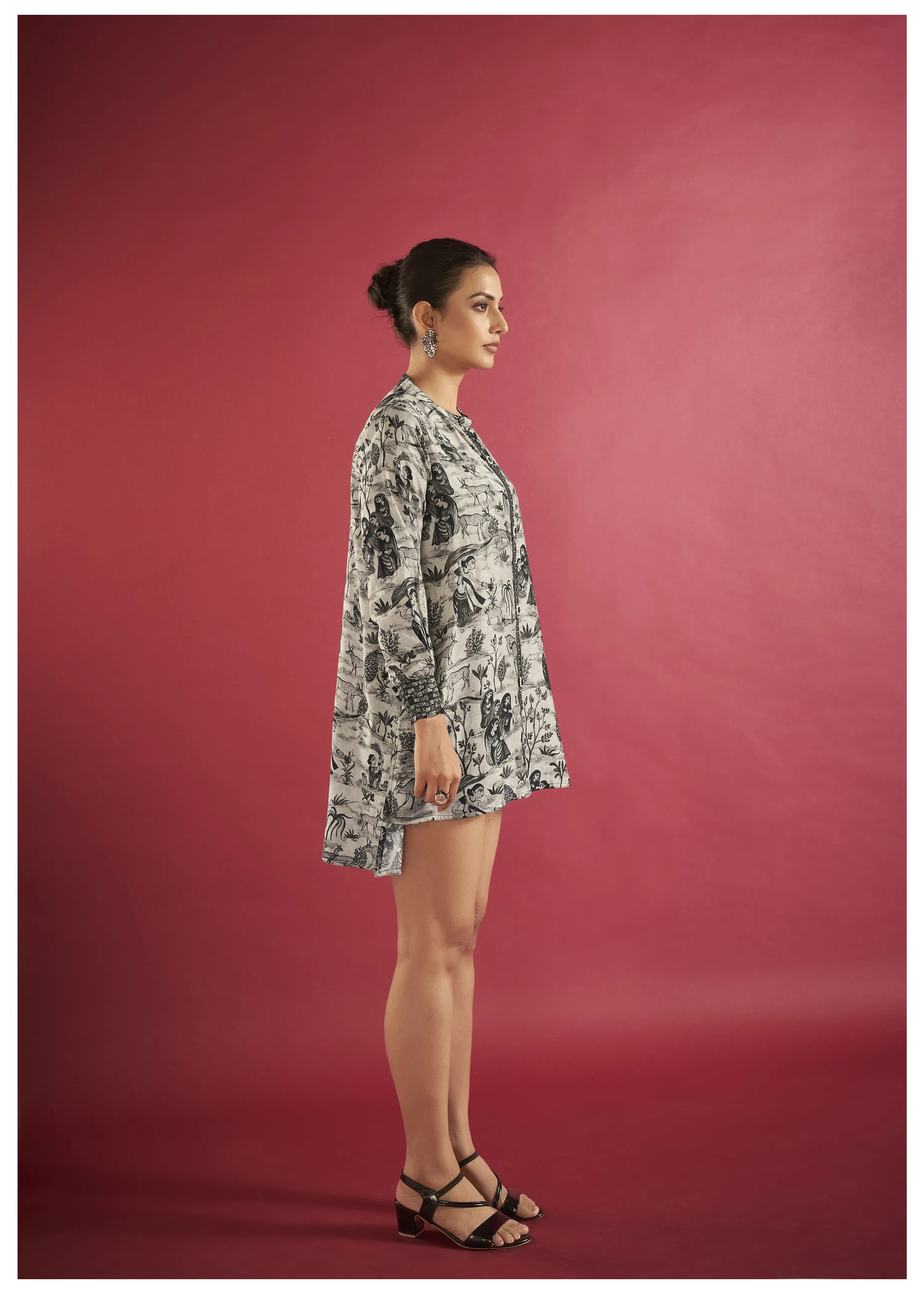 Elevate your casual wardrobe with this striking white and black printed muslin tunic. The bold print combined with a sophisticated high-low hemline offers a modern, stylish twist on classic comfort. Crafted from breathable muslin, this tunic features a mandarin collar, 3/4th sleeves with cuffs, and a button closure, making it the perfect blend of fashion and function.