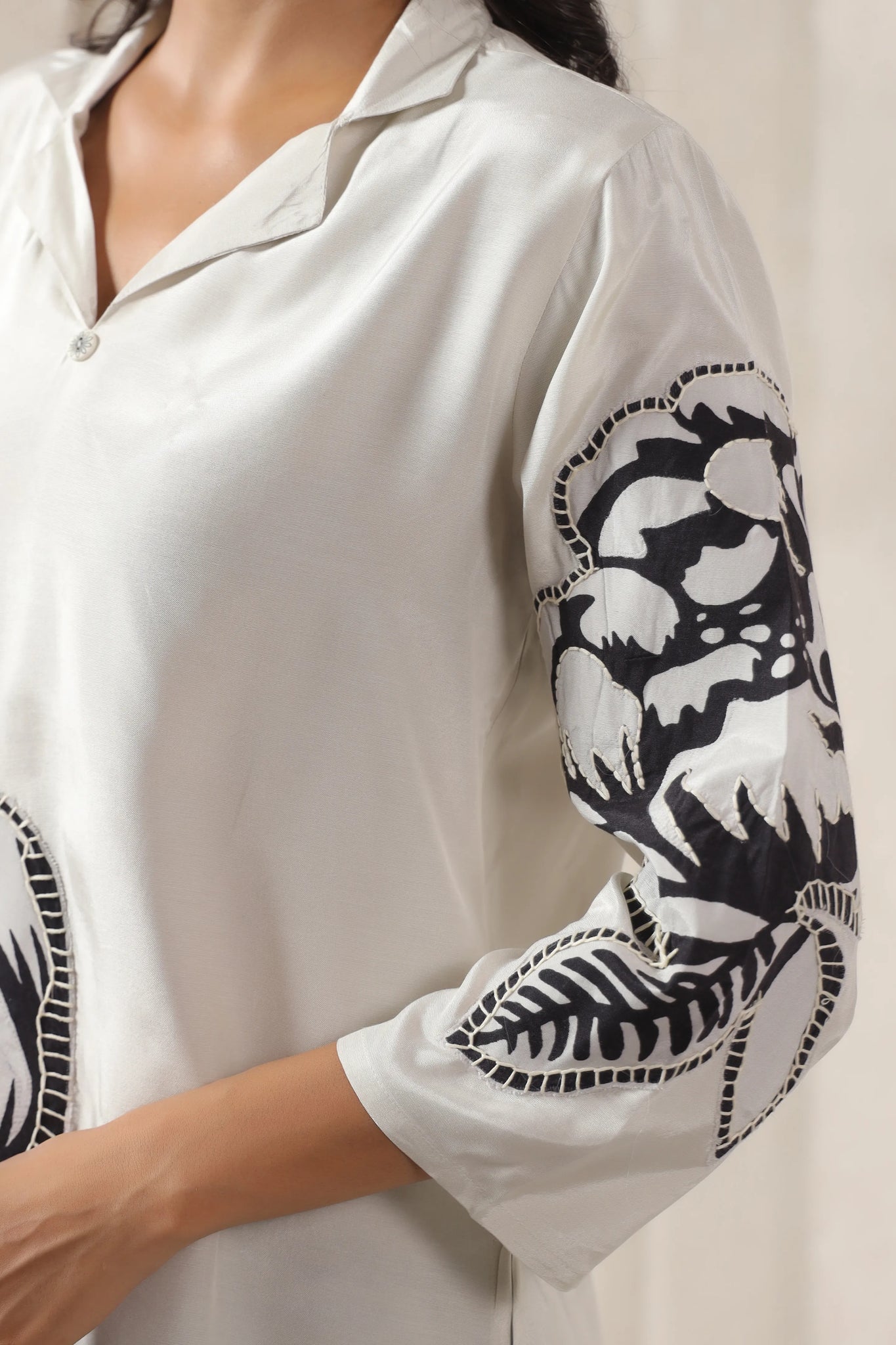 Redefine understated elegance with the White & Grey Floral Stitch, a sophisticated top crafted in luxurious Russian silk. Set on a crisp white base, the design features a striking light grey bold blanket stitch flower patch placed for maximum visual impact. The notch collar and button-front closure bring a refined touch, while 3/4th sleeves make it an effortlessly versatile wardrobe essential.