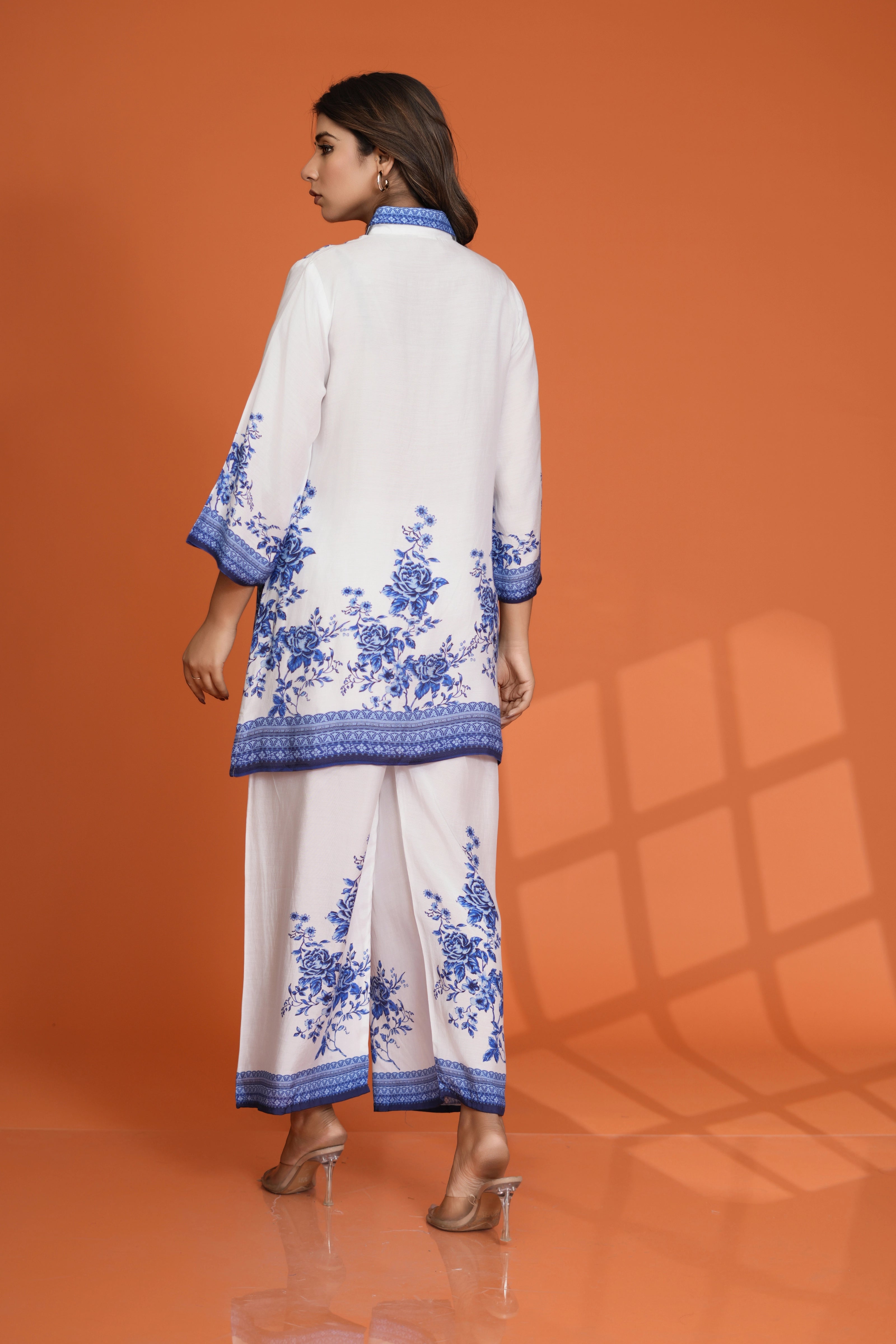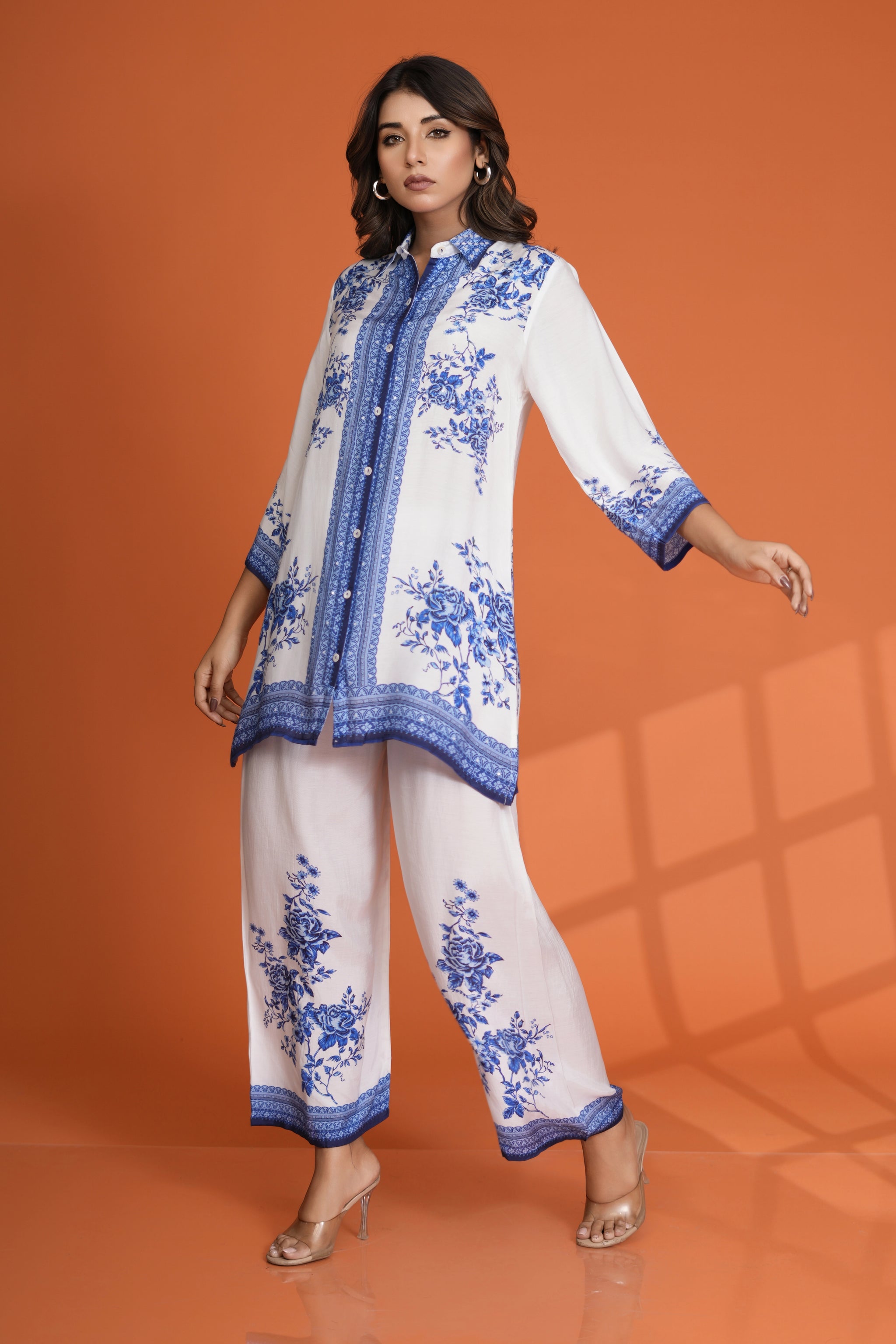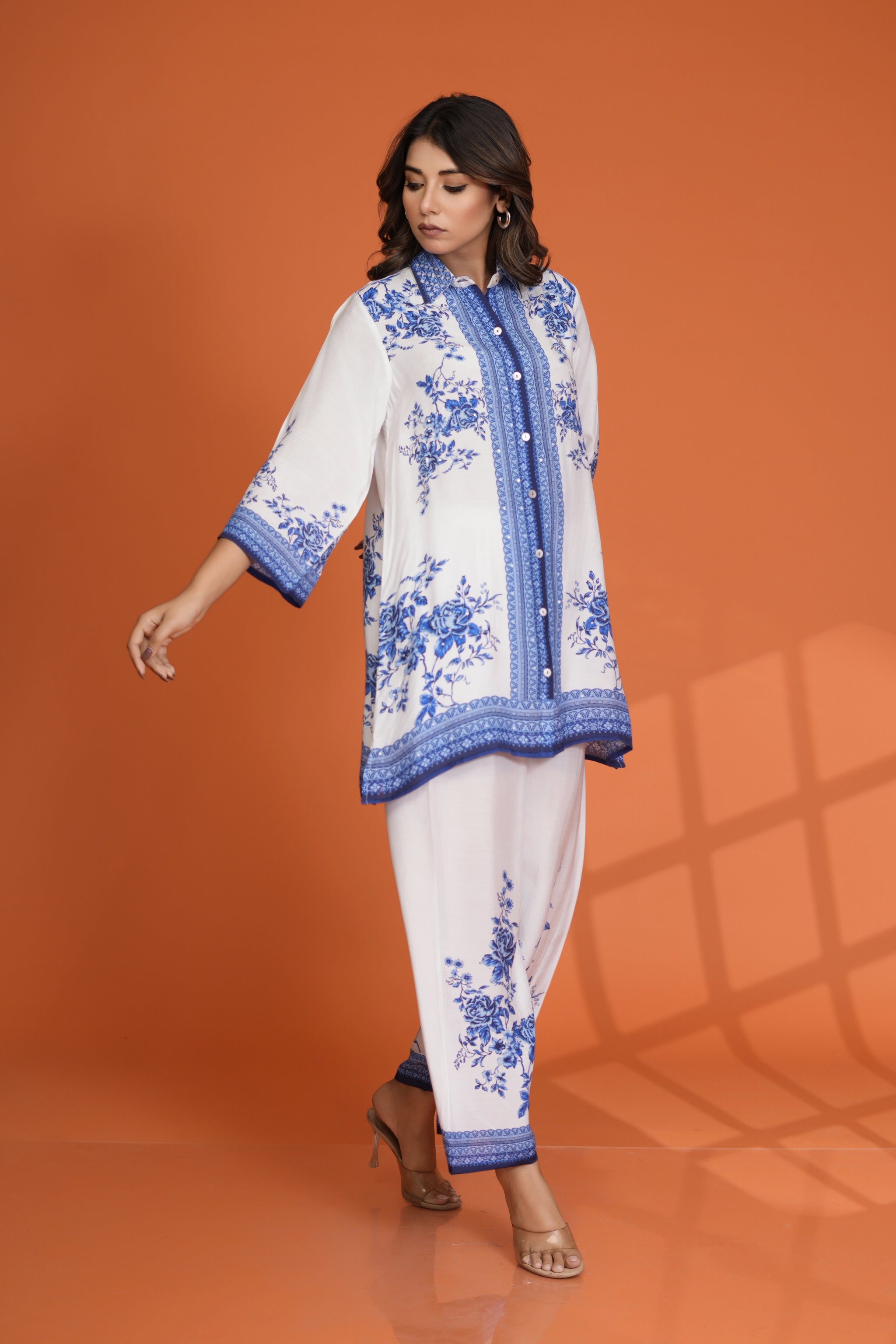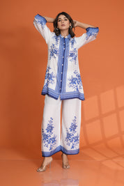 White & Blue Floral Border Print Muslin Co-Ord Set