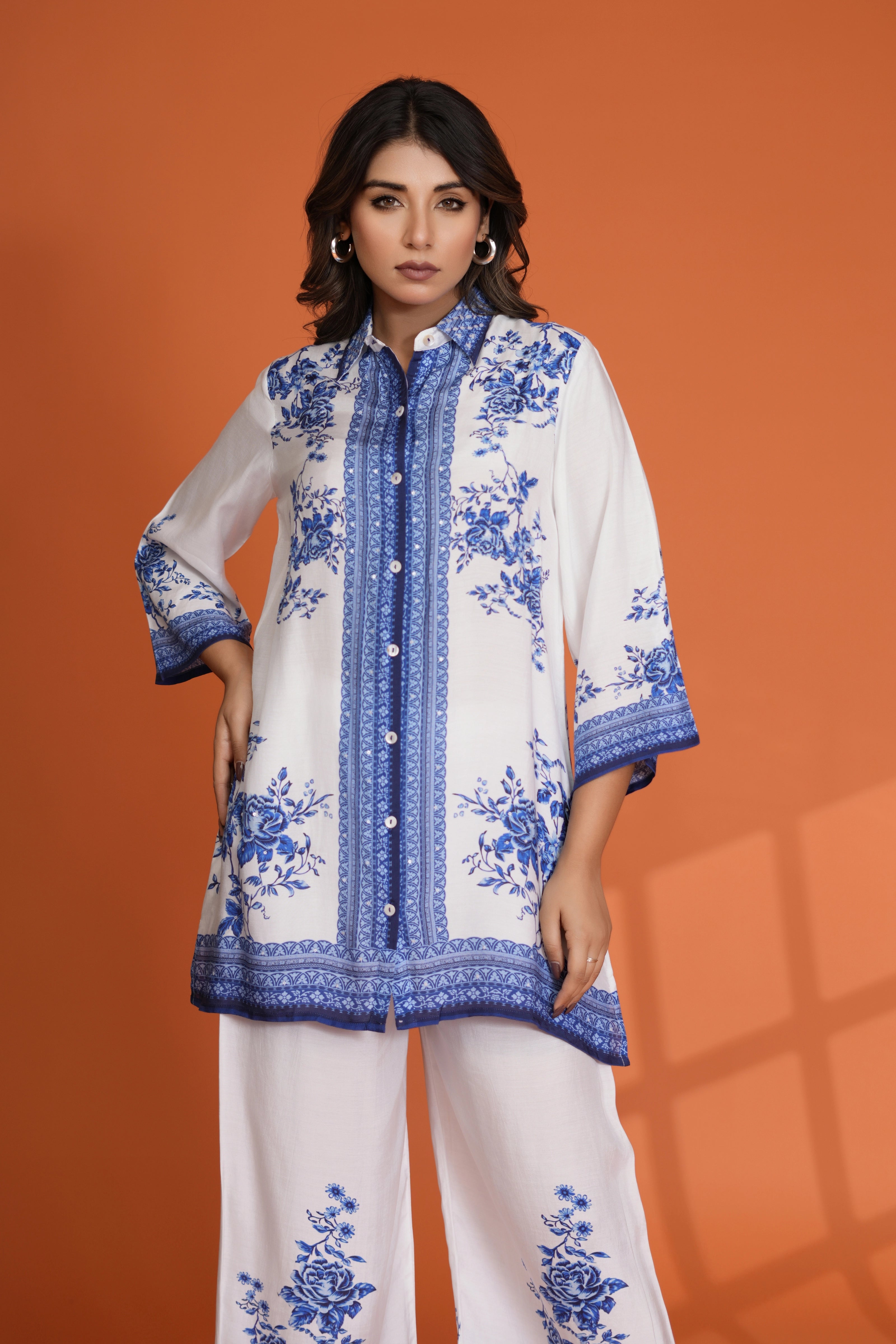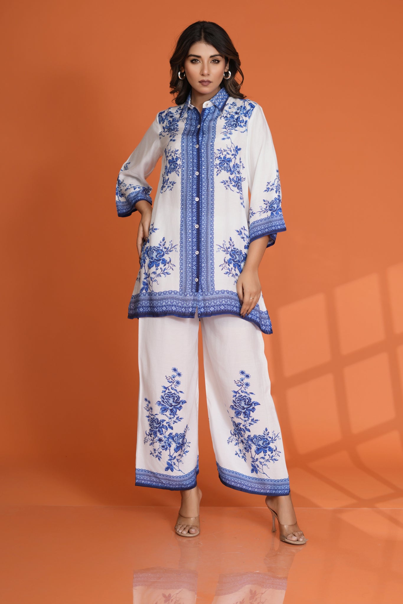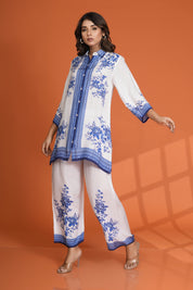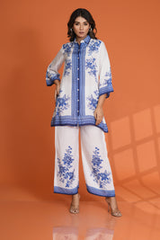 Elevate your everyday style with this White & Blue Floral Border Print Co-Ord Set, crafted in soft muslin for a breezy and effortless look. This elegant set features a shirt collar button-front top with 3/4th sleeves, adorned with floral placement and border prints. Paired with wide-leg pants, this ensemble offers both comfort and sophistication.