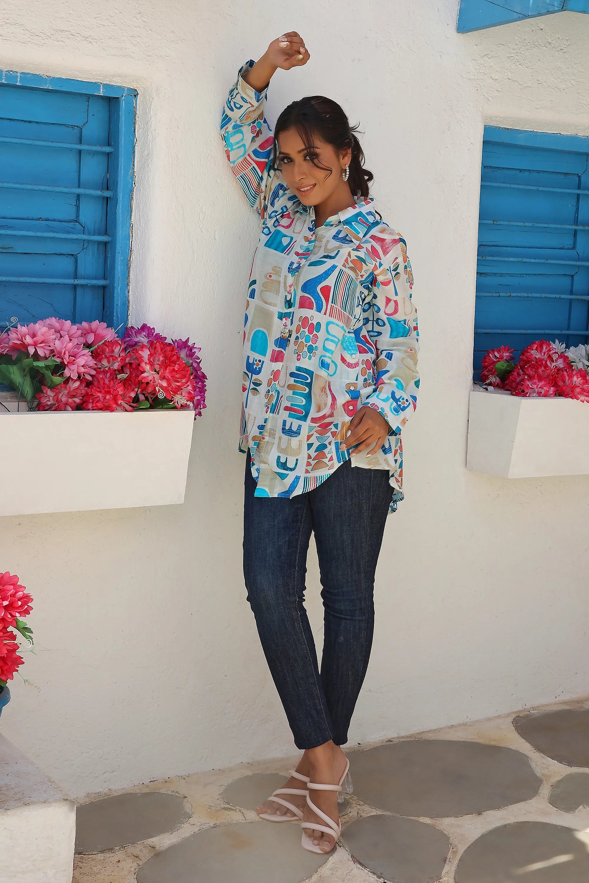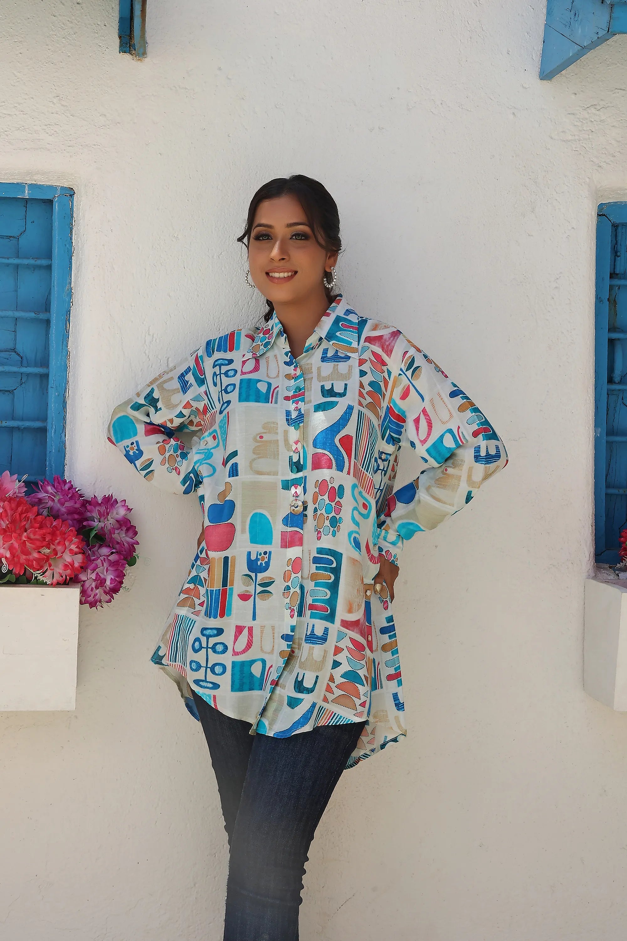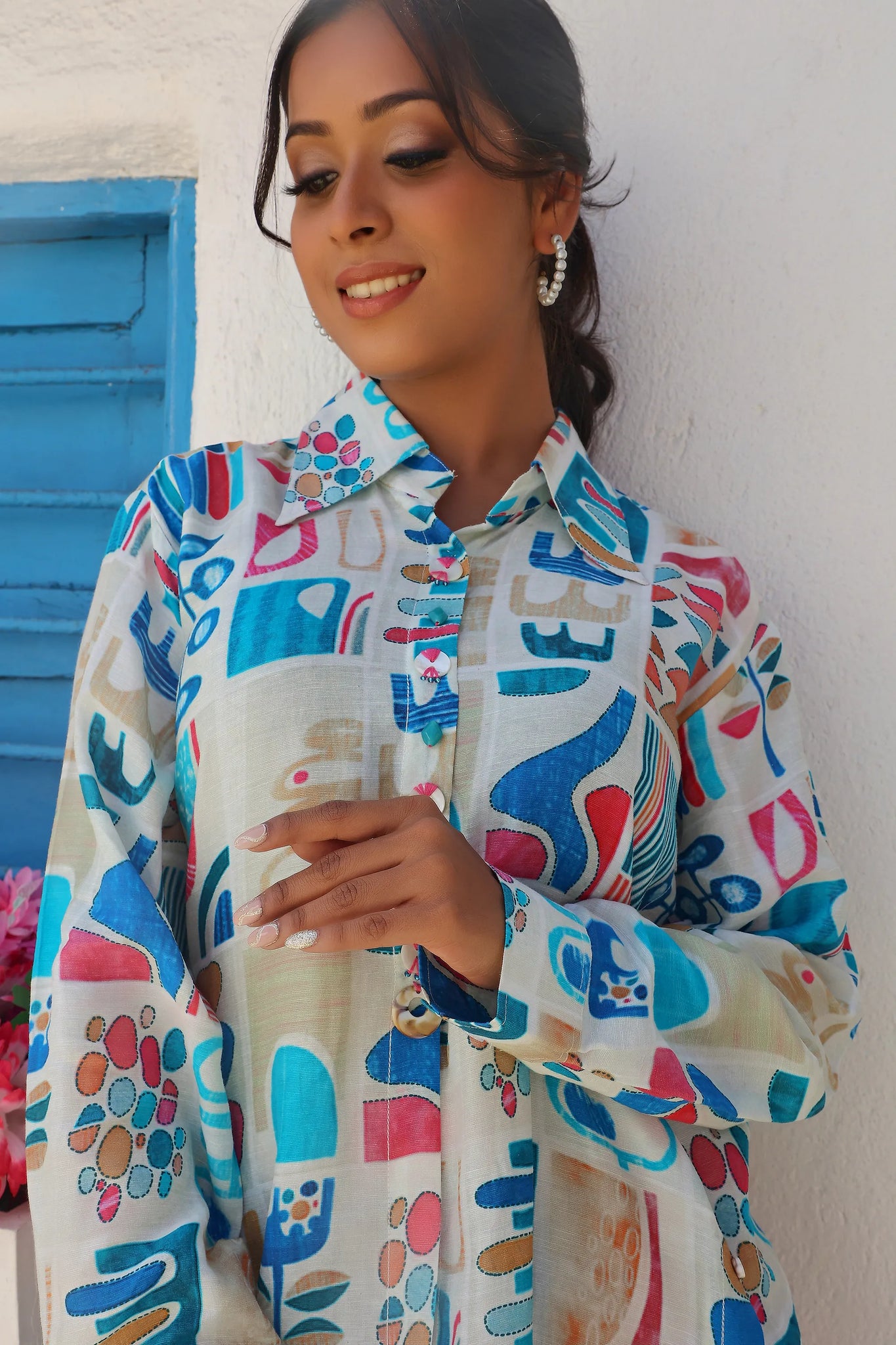 White Longline Printed Shirt Style Tunic With Beads