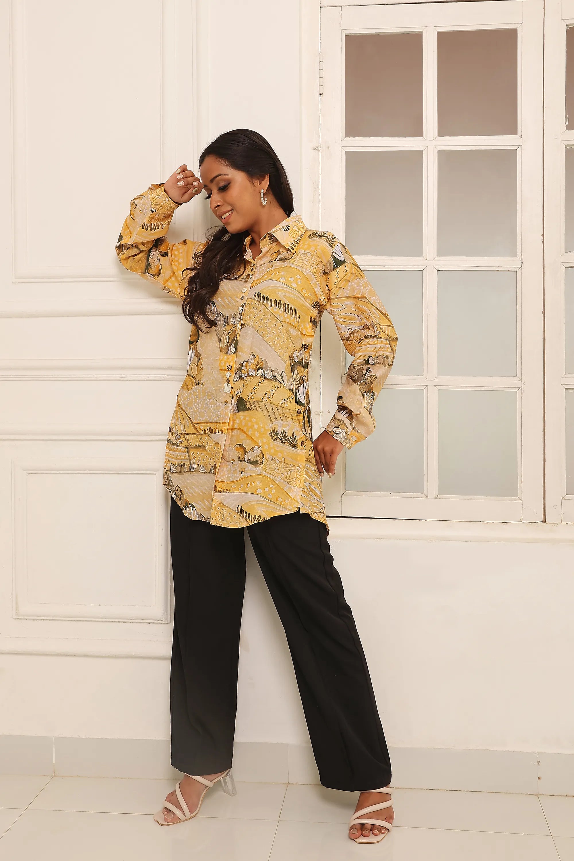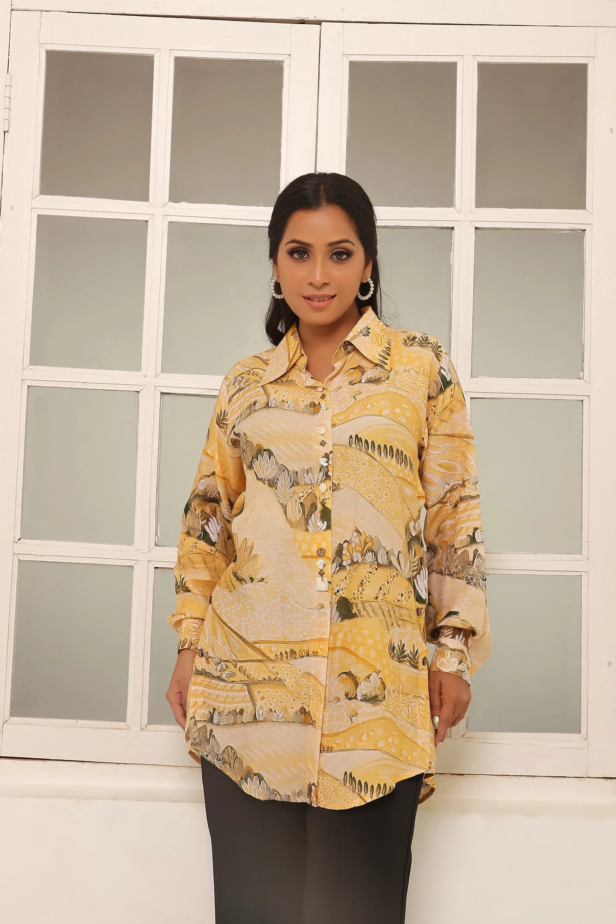 Add a touch of elegance to your wardrobe with this Yellow Printed Shirt-Style Tunic, designed for a chic and sophisticated look. Featuring an abstract print with delicate embellishments, this tunic is perfect for both casual and semi-formal occasions.