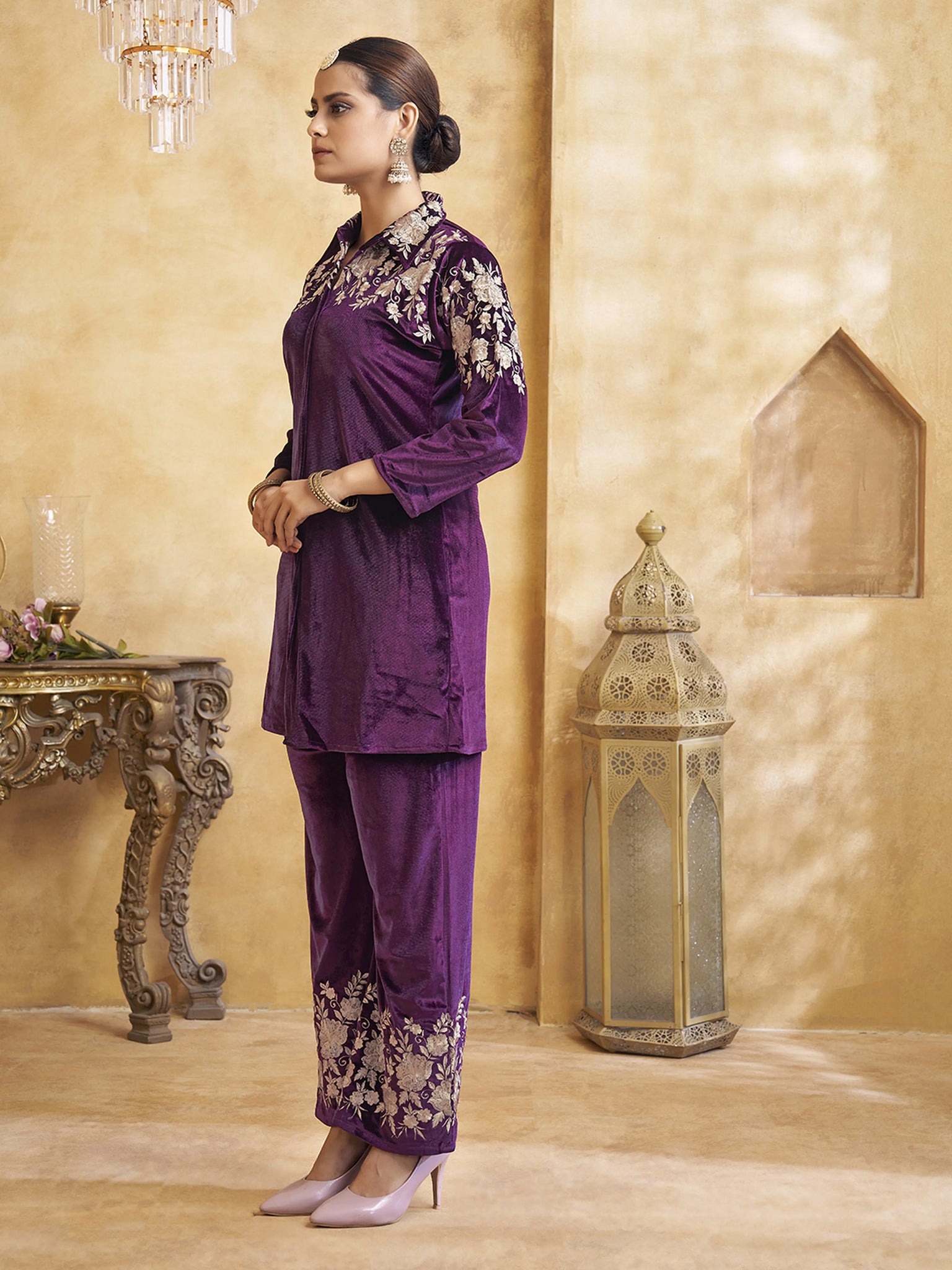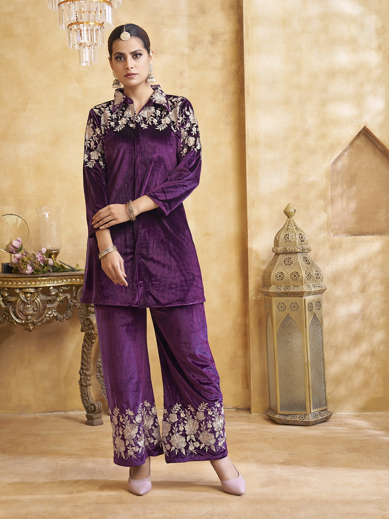 Royal Reverie: Zari Embroidered Velvet Co-ord Set in Deep Purple
