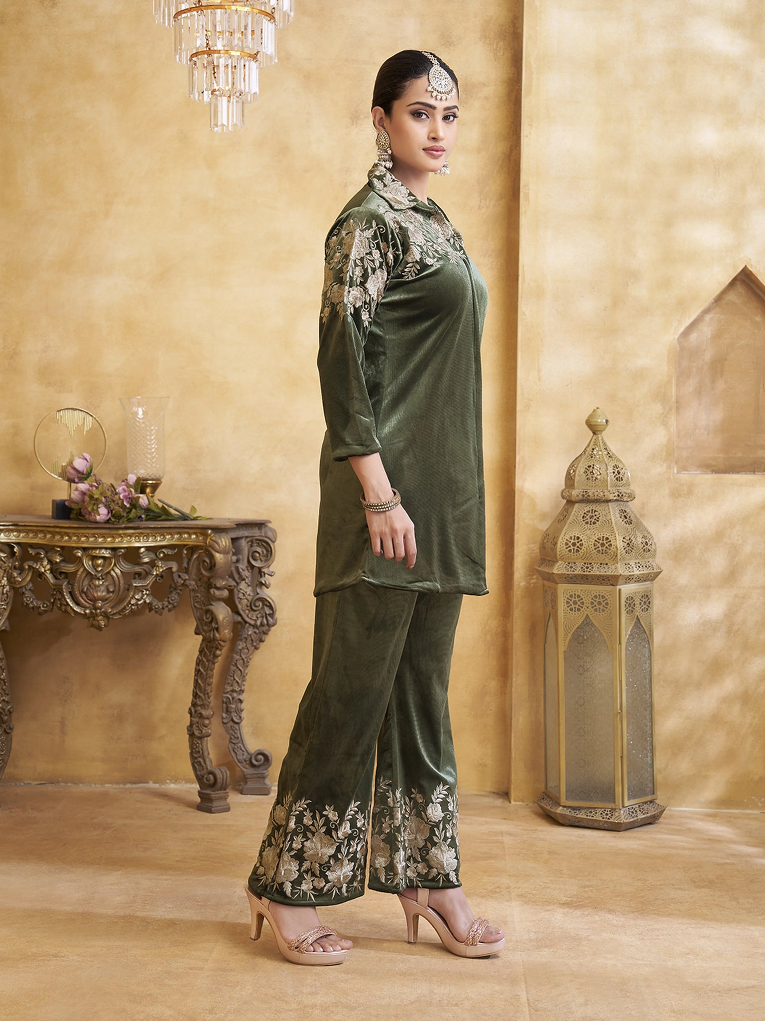 Emerald Grace: Zari Embroidered Velvet Co-ord Set in Fern Green